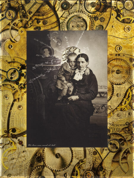Digital collage image transfer on metal leaf mounted on cradled wooden panel (two sided) 12″ x 18″.