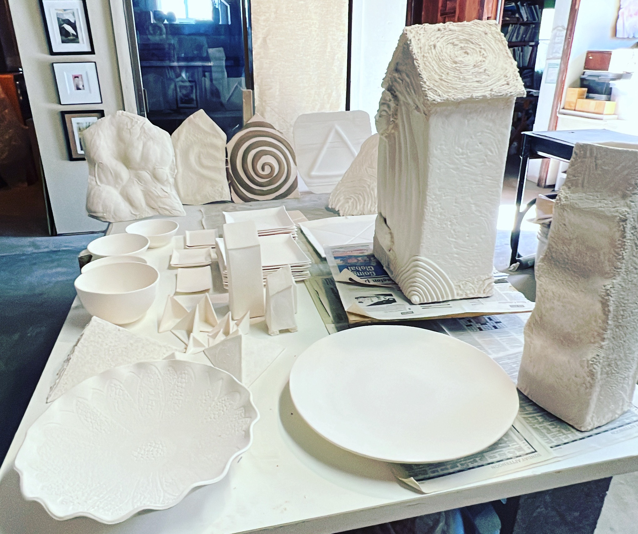 THis is a picture of a whole kiln load of bisqued ceramics that I need to glaze (color) in order to have finished pieces.