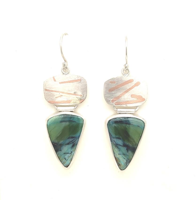 Indonesian Wood Opal Earrings in silver and copper accents. I cut this rare petrified wood which has been replaced by opal and contains thin strands of metal copper. I used a butterfly cut technique to create mirror images in the uniquely shaped earrings. Made with fine silver bezel and sterling silver components with copper wire accents.