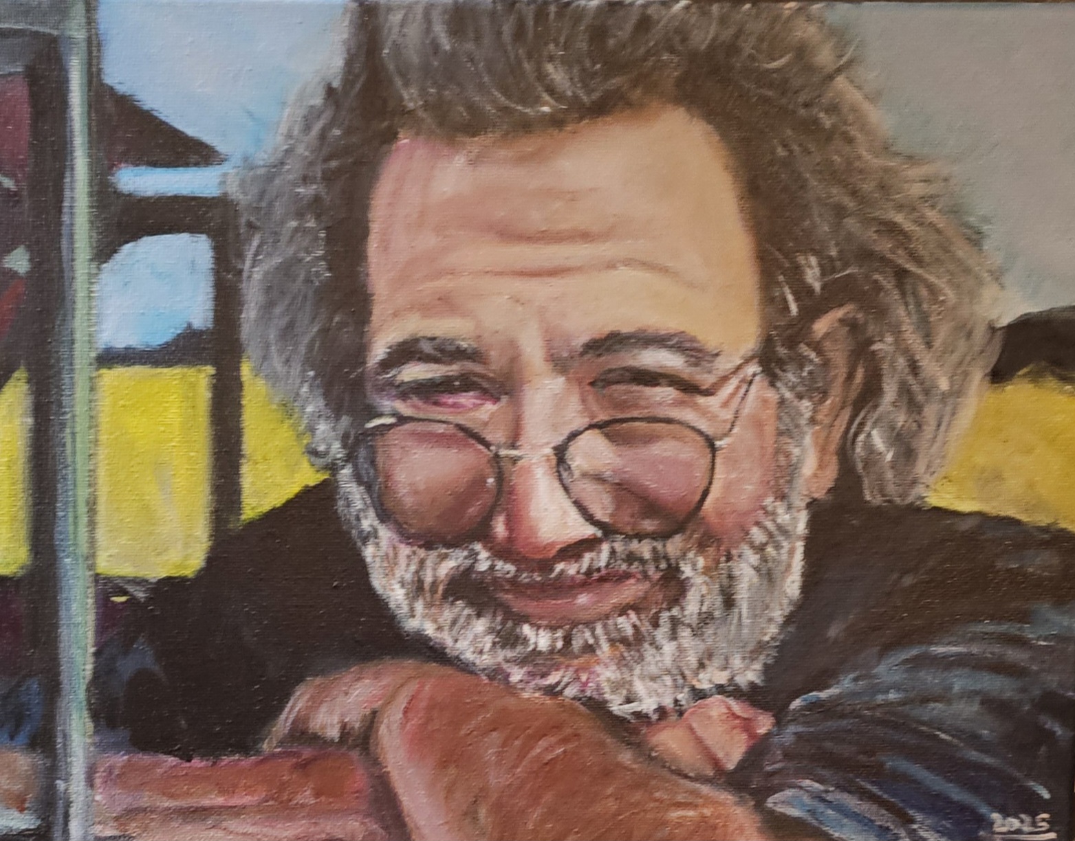 A portrait of Jerry Garcia seated in a car, surrounded by blue sky and golden fields.