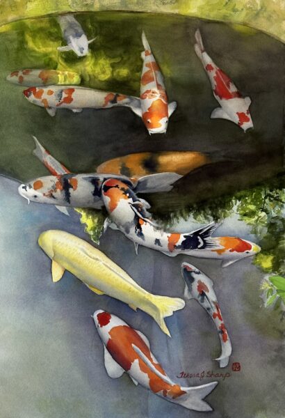 The reference photos I used to create this moment in a beautiful Koi pond were taken at my favorite cafe in Kyoto Japan. We lived in Yokohama for 4 years and my frequent visits to Kyoto always included a stop to see the Koi in their garden pond.