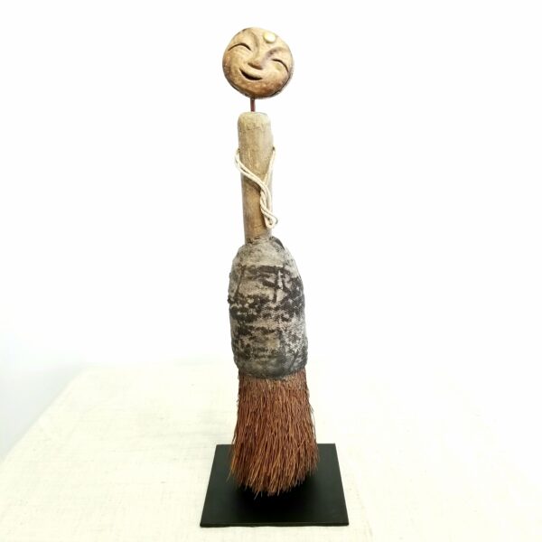 Hand sculpted and painted clay head (with mantra Om Mani Padme Hum inscribed on back of head) placed atop a vintage Chinese brush.