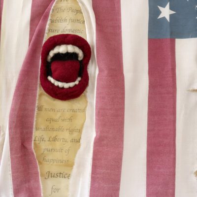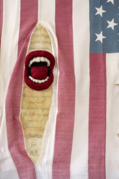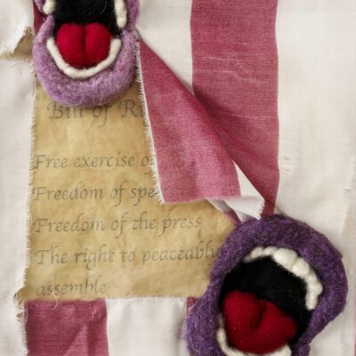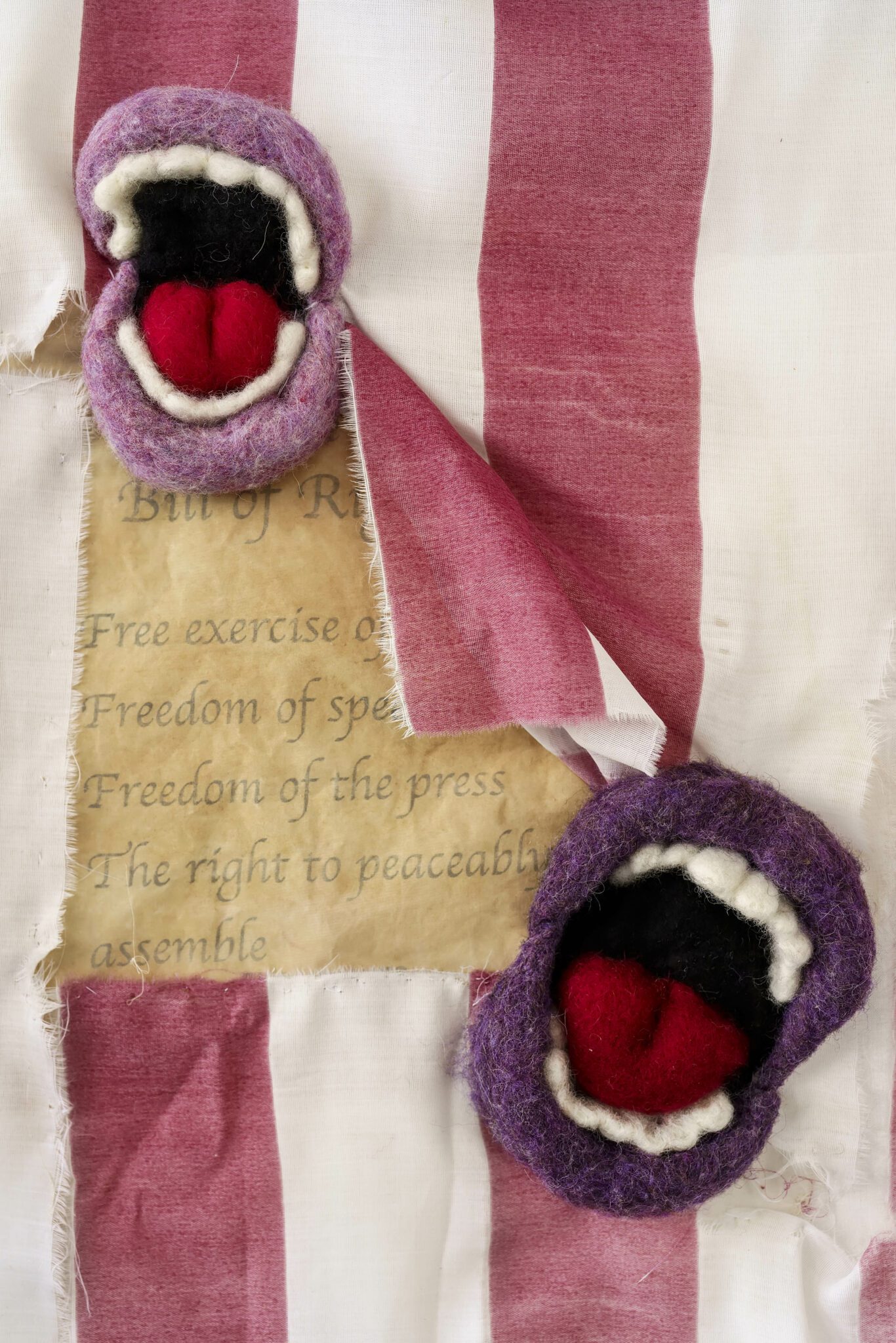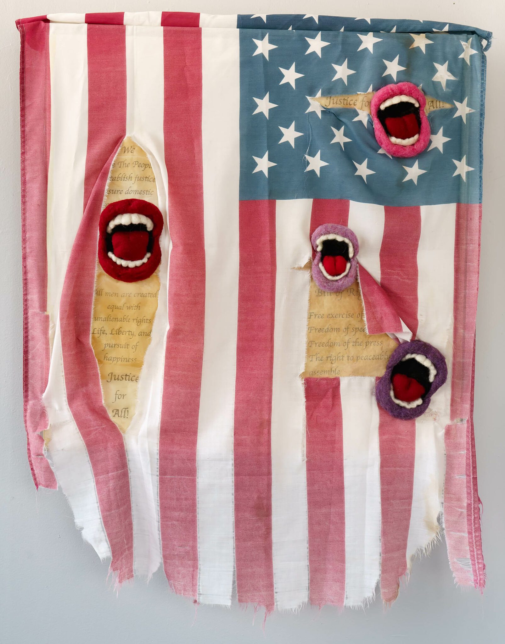 Naturally distressed American flag, emerging needle-felted mouths, tea stained silk with photo transferred text from the Bill of Rights and US Constitution.