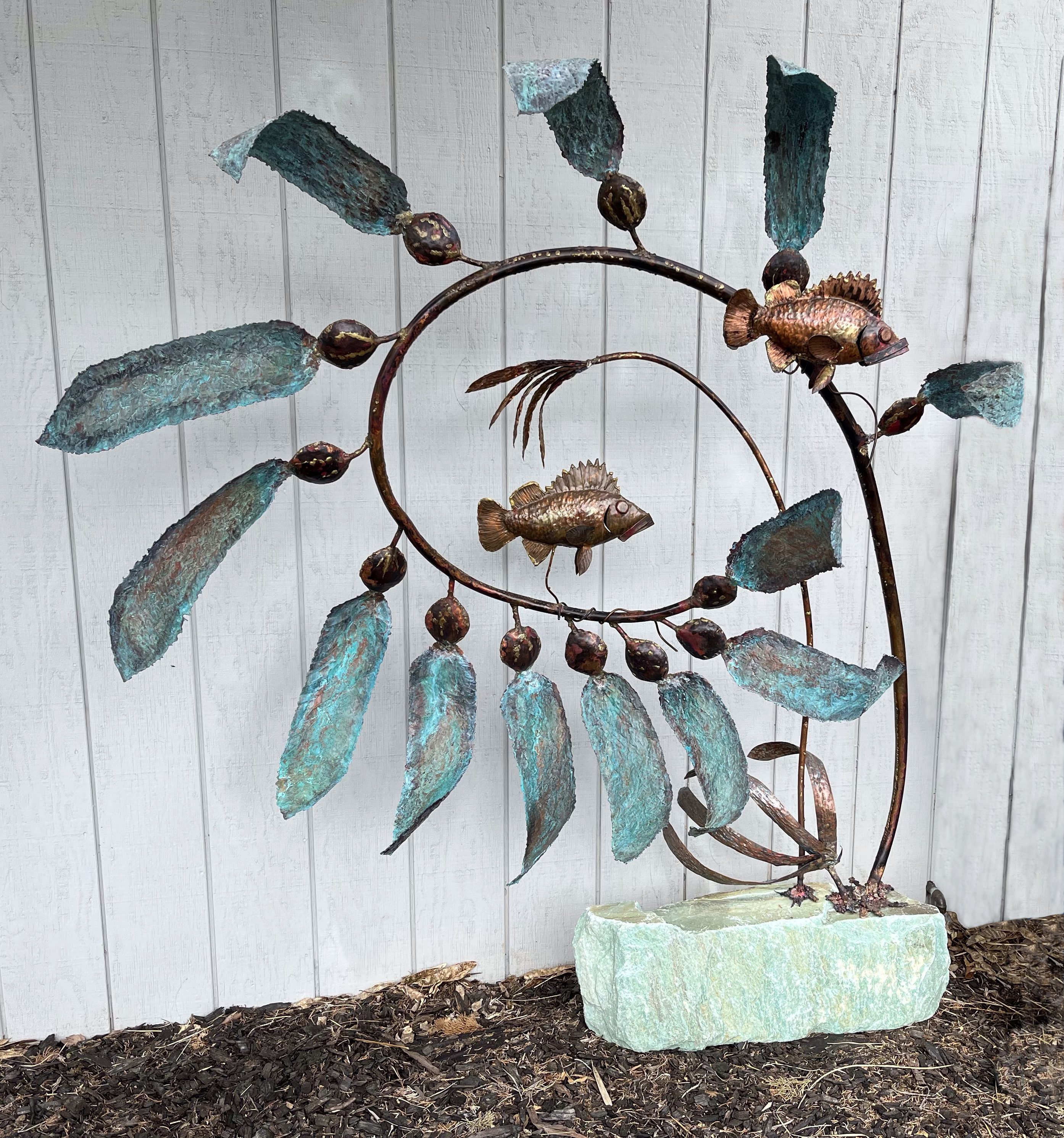Pacific Giant Kelp pods twisting and bobbing in the current with Copper Rock Fish. Copper and Wyoming Blue Arctic stone. 72”h x 28”d x 64”w