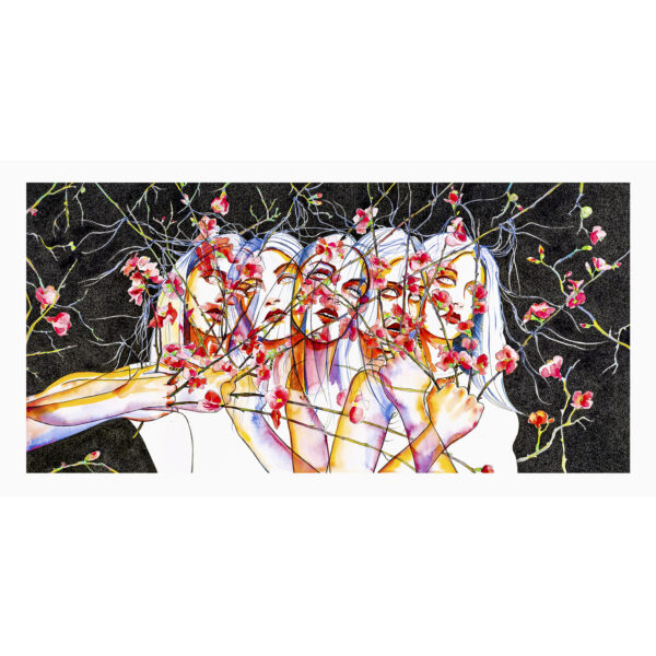 Kiss With a Fist was composed in watercolor, pen and ink and gouache on paper as part of the Ghost Garden series (2017). Original painting is sold to a private collection. Signed limited edition archival digital prints are available in multiple sizes.