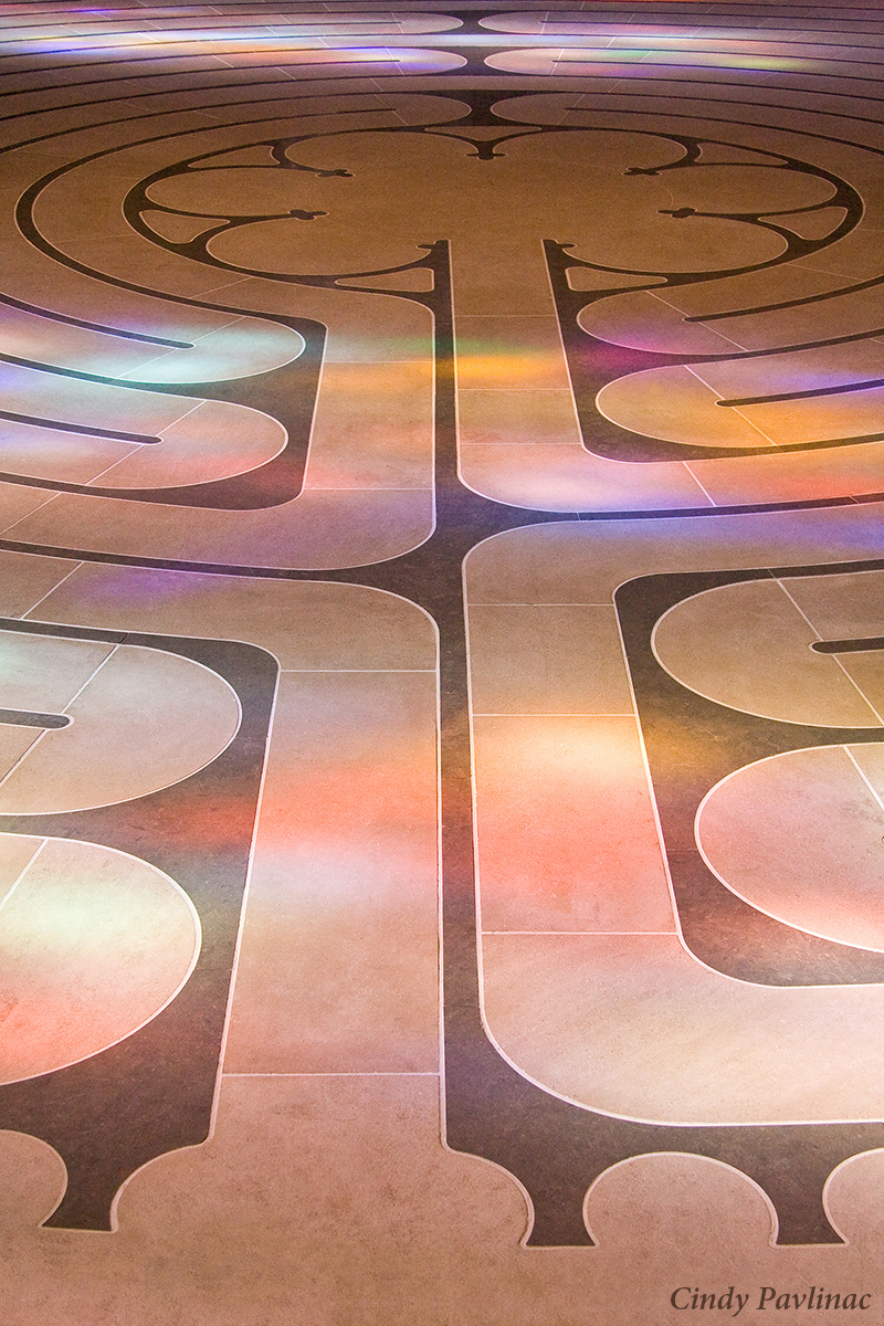 Brilliant colored light pours through stained glass windows to brush the new stone labyrinth. Winter sunlight outside is transformed into a gliding display of dazzling rainbows in the dark interior of the peaceful cathedral. Walk in the light!
