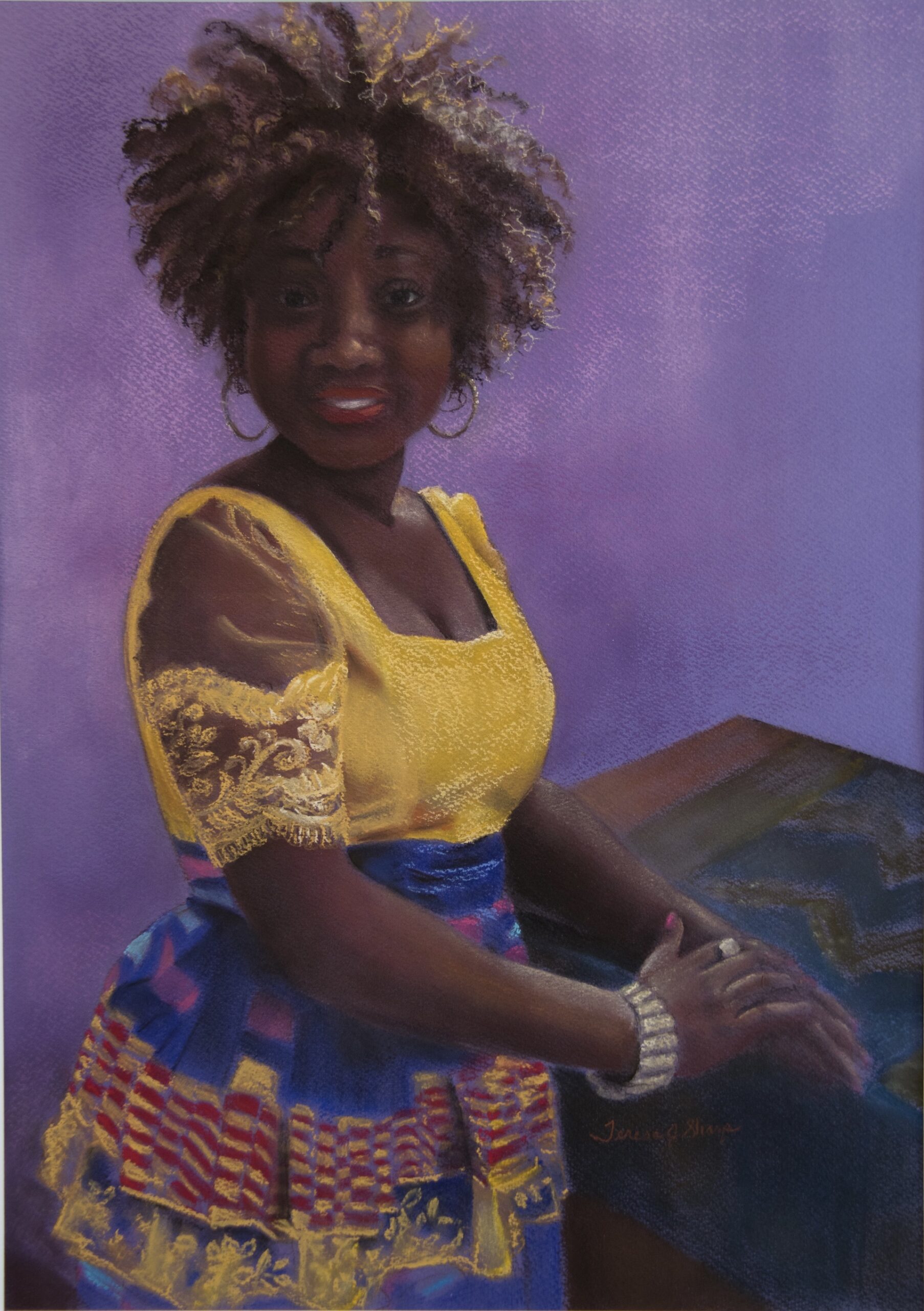 This pastel painting was created from a photo I took during a serendipitous meeting. I had moved from California to Japan and was learning to use pastels at a small art school in Yokohama. As I sat in church one Sunday morning, thinking about what I would paint the next day, I saw this beautiful women in her colorful dress and asked if I could take her photo to use as a reference in my work. She agreed to the photo and told me she lived in Nigeria and was attending a conference in Yokohama. We exchanged information and that’s when I found out her name was Lady.