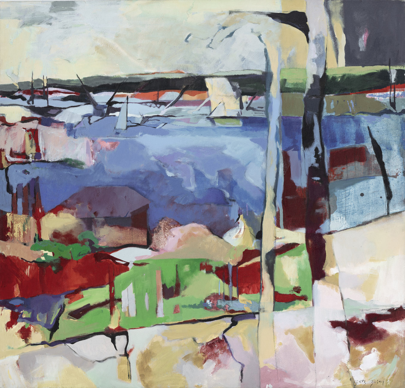“Susan Goetz Zwirn’s Landscape Boundaries, winner of an award, shows how abstraction can push a familiar scene to the limits of recognizability. Using unnaturally intense colors and faceted forms, the painter reinterprets a tranquil harbor in imaginative terms period.