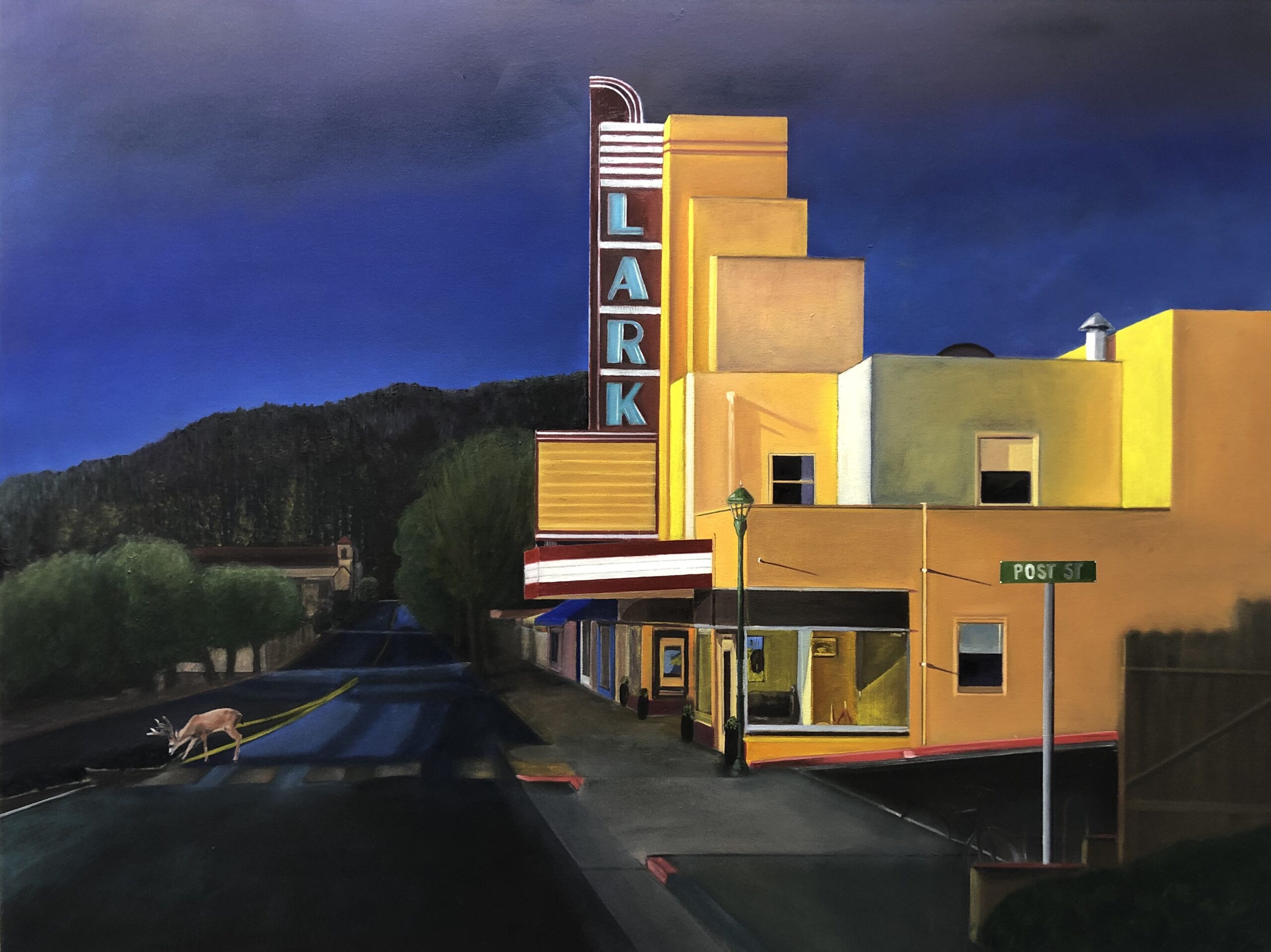 The Lark Theater Larkspur CA. I’m drawn to this building the way light changes the large masses the rectangles the shadows cast the yellows and oranges in bright sun light and the blues and coolness under cloud cover. This is my second painting of the Lark and I imagine at least one more. I’m a fan of the writings of Cormac McCarthy. This building and the avenue disappearing into the forest at the rise near the library are particularly intriguing and bring to my mind some mysterious unseen event. This piece represents numerous visits to the site during day and night and in the rain. As with most of my paintings much has been altered from the original scenes. I am particularly drawn to strong geometries night rain shadows and deeper warmer colors. My wife an art history major calls my paintings expressionistic realism. The deer was in our driveway in San Rafael.