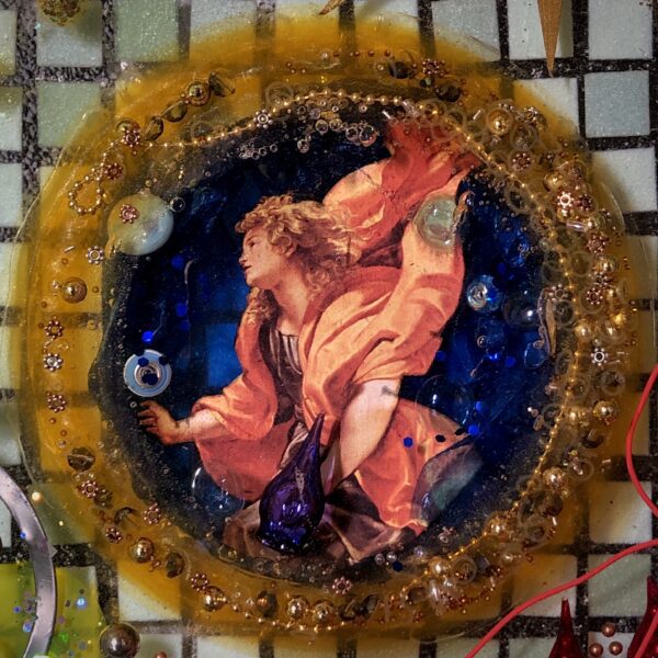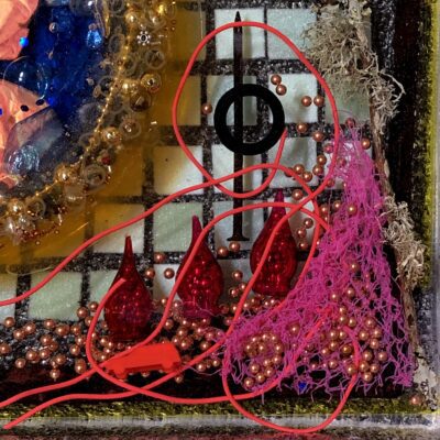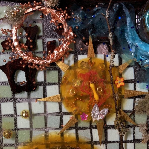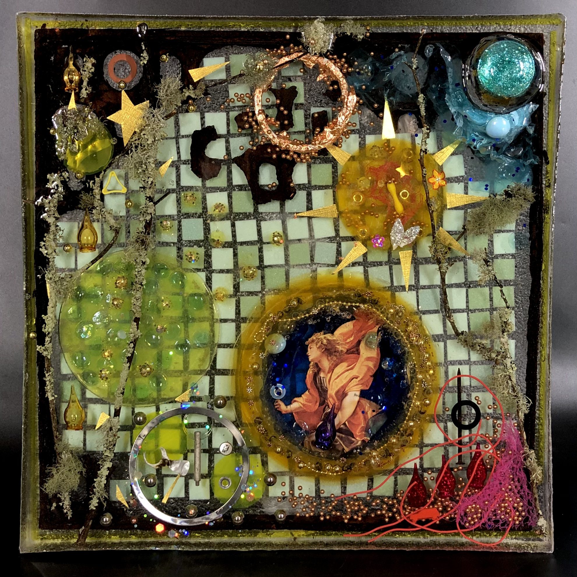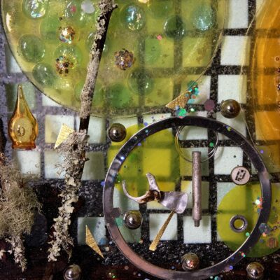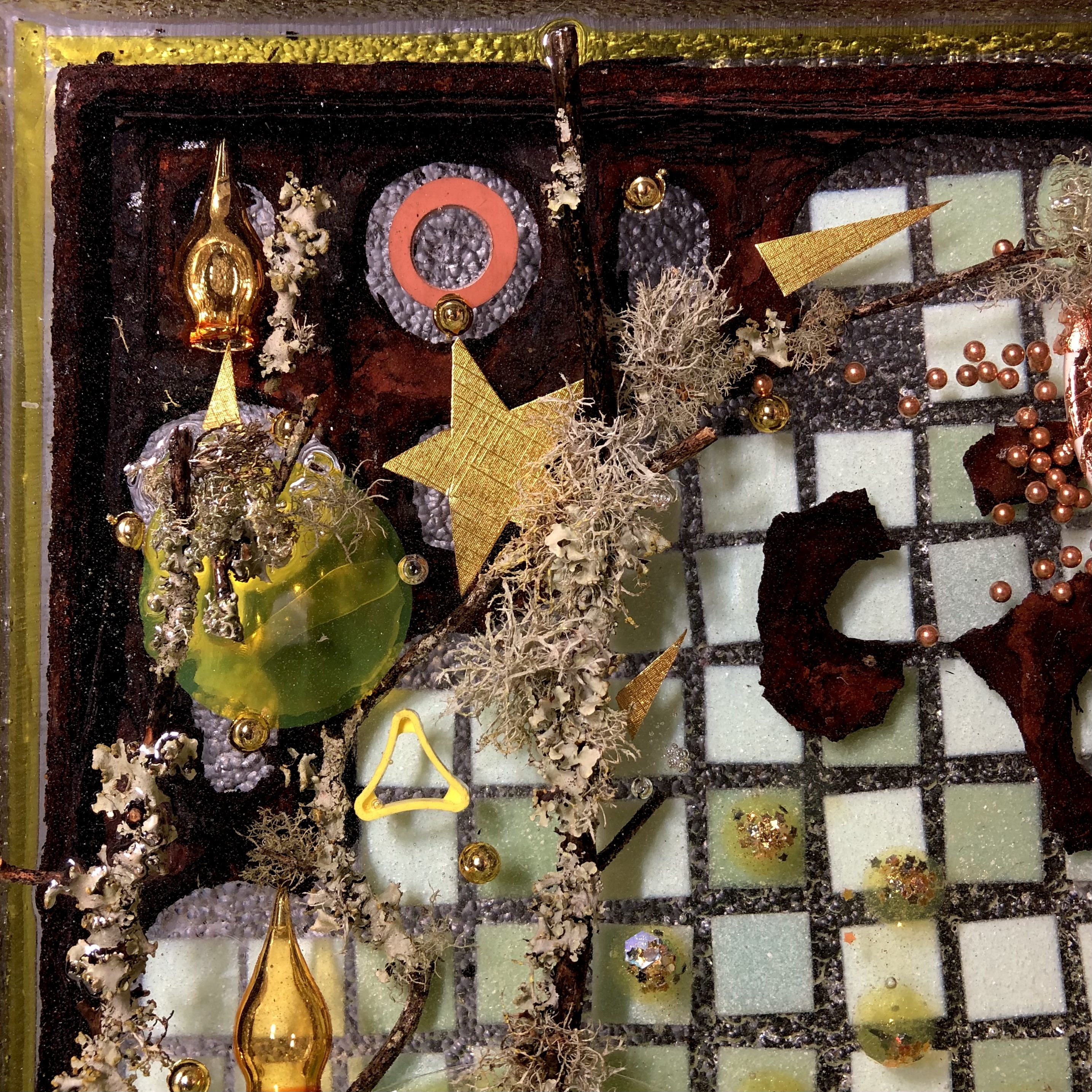 Acquired and found objects, paper collage, epoxy resin.