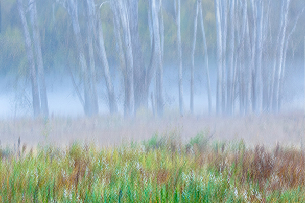 Misty Mirage draws the viewer from a grassy field into the misty and an alluring forest. It gives one a feel of comfort with the soft misty moving in and out of the grasses and the trees. The tones are an inviting green but blends into the gray white mist and the brown tones of the forest.