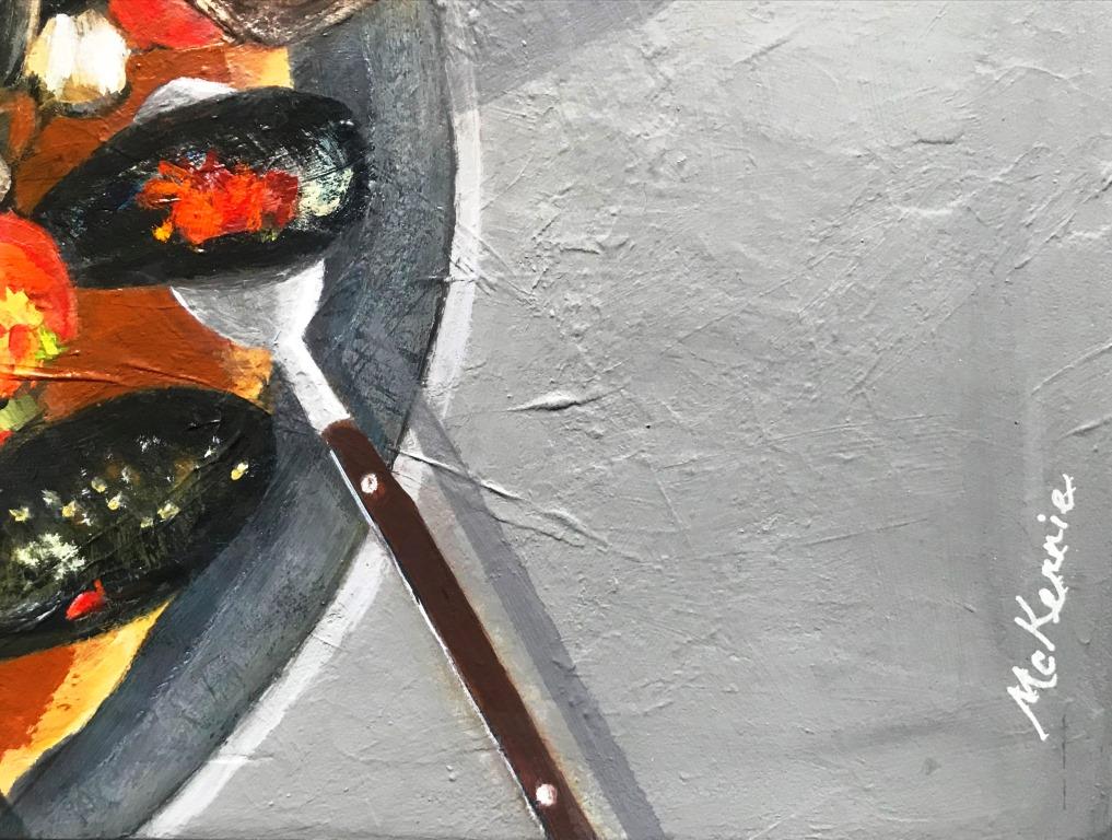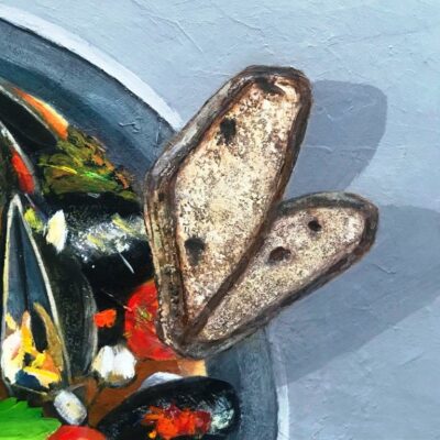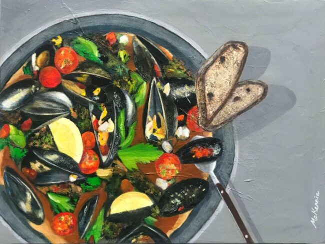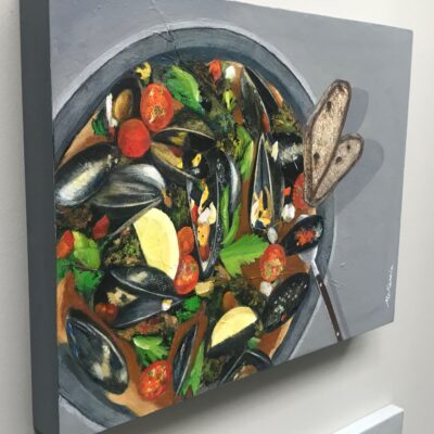 My husband’s gourmet cooking inspired this painting of a colorful dish of mussels in broth with garlic crostini with their varied textures.