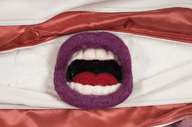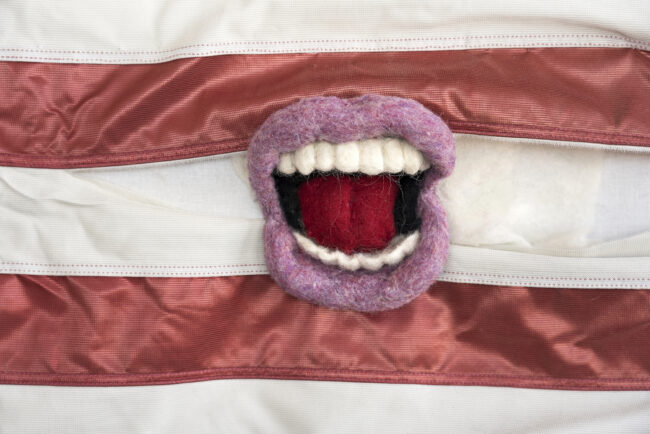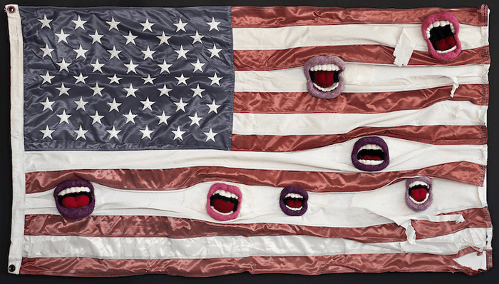 “Mouth Off” is the first in the series of American Flags and felted mouths that reflect the empowerment of women, children, and men who have found their strength in numbers as they speak out against sexual abuse, gun violence, and the erosion of our civil liberties.