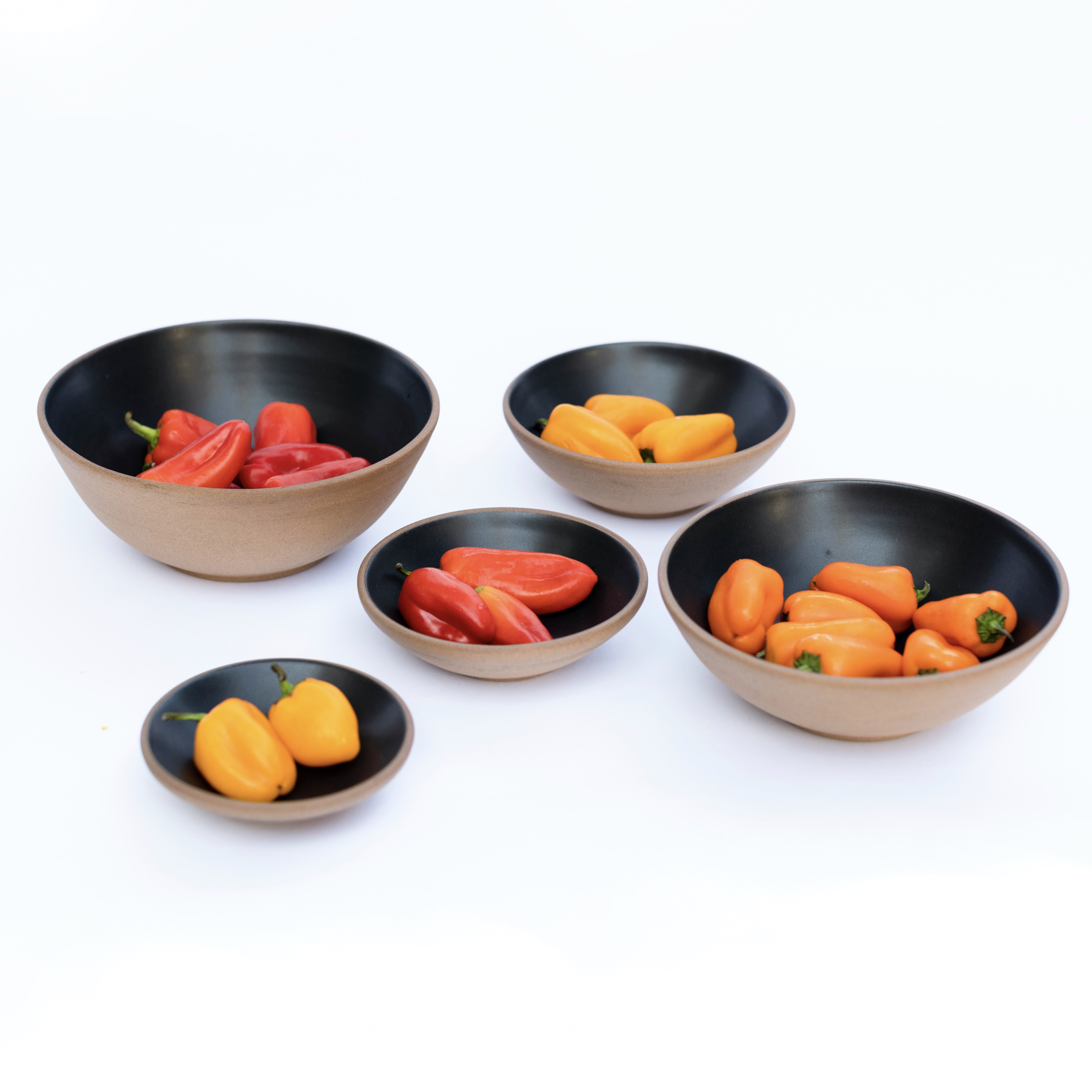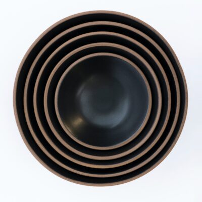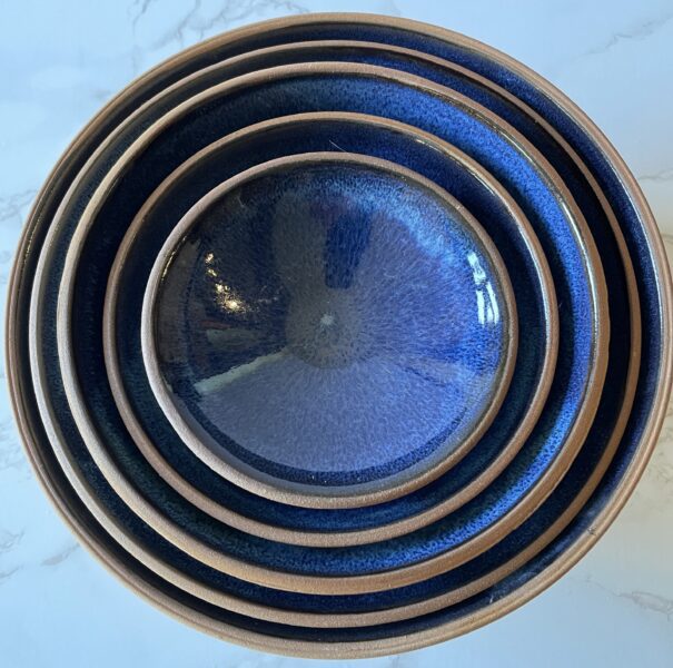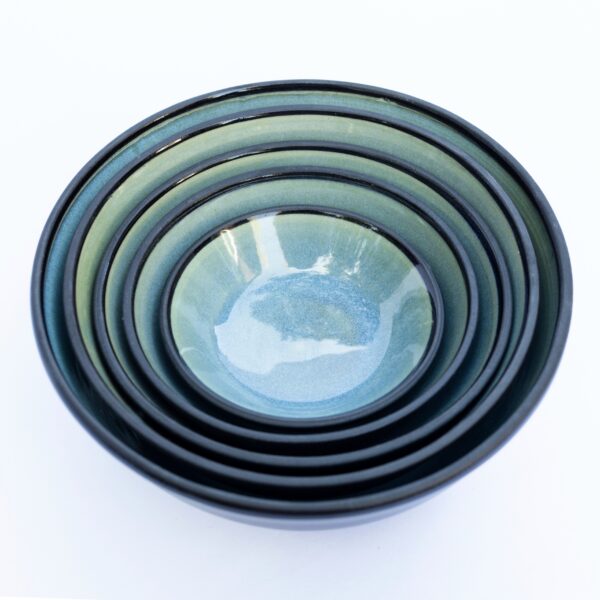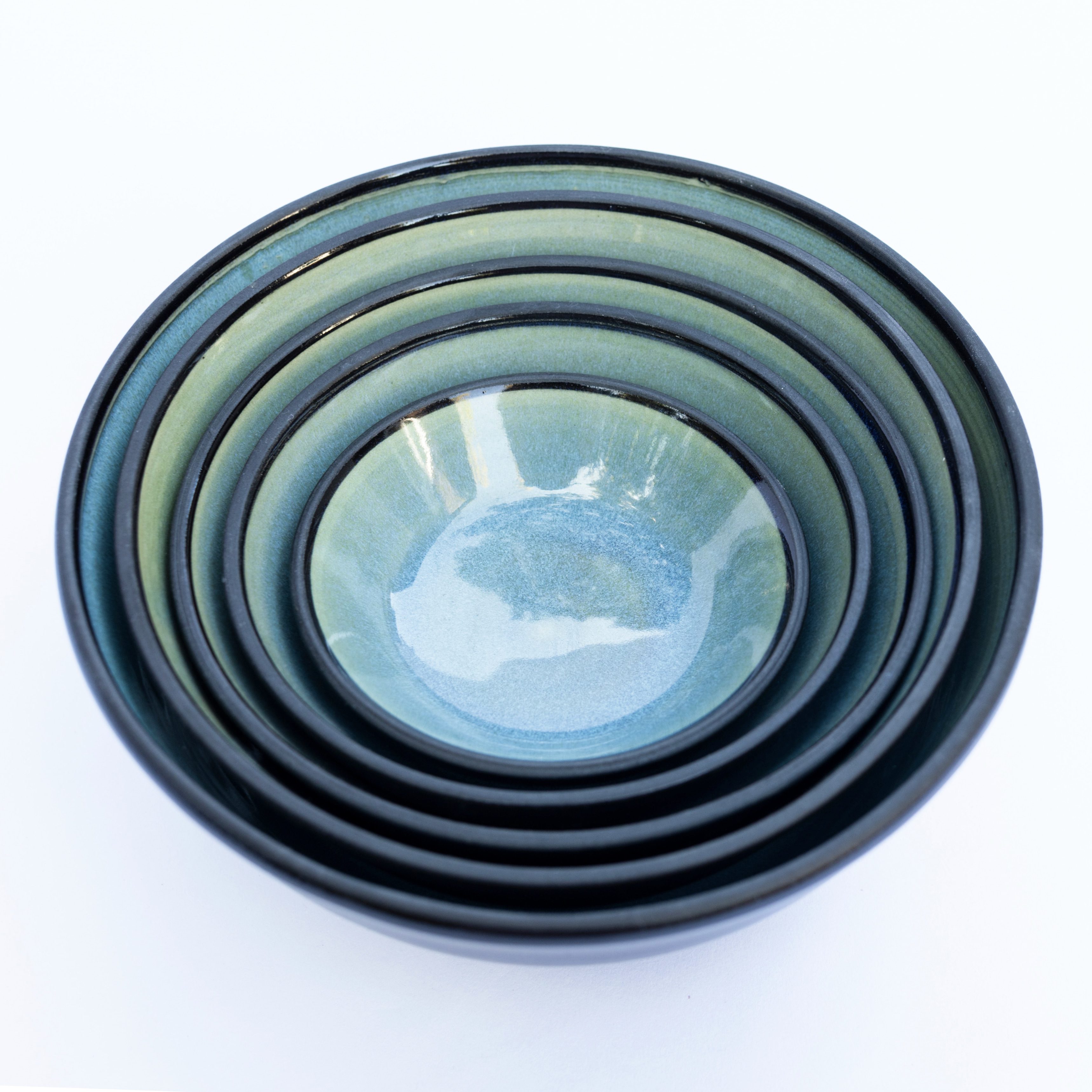 This nesting set includes five bowls that were thrown on the wheel using white stoneware clay. Starting with the largest and working backwards, I sized them so that they comfortably nest inside each other. Available in turquoise, black, and indigo.