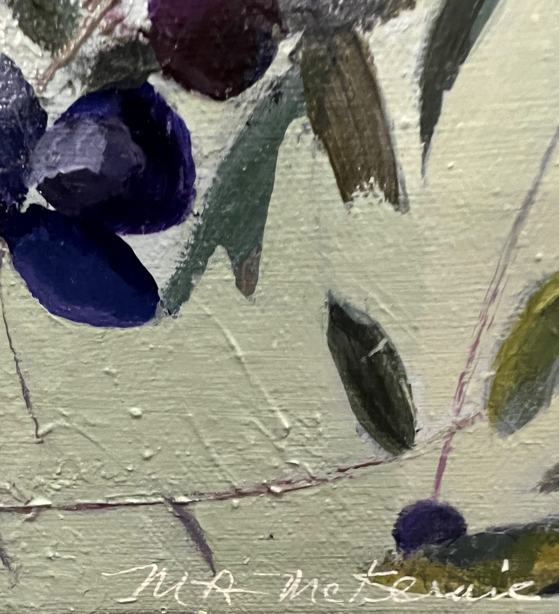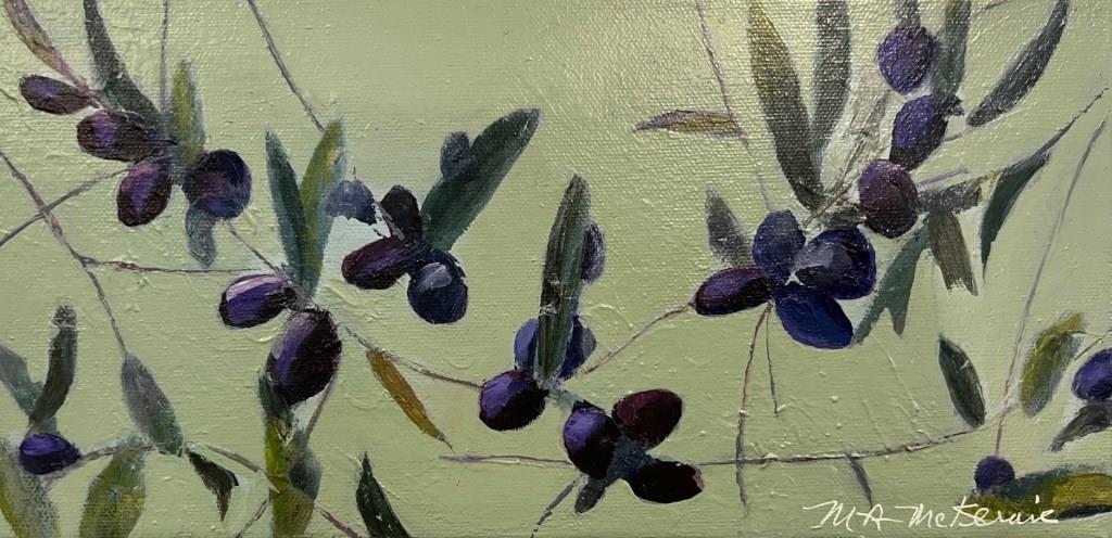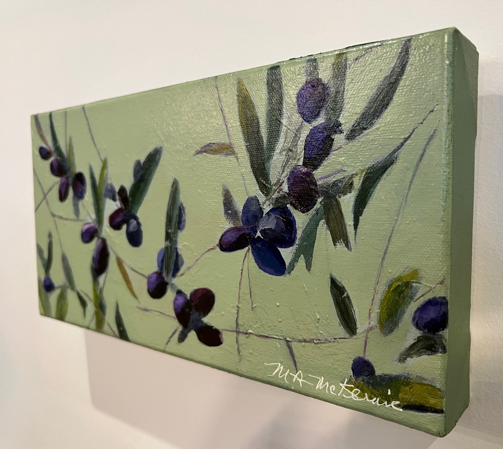 The second in a series of three paintings depicting olive branches on the trees in our front yard, this one rendered in pale green and purple.