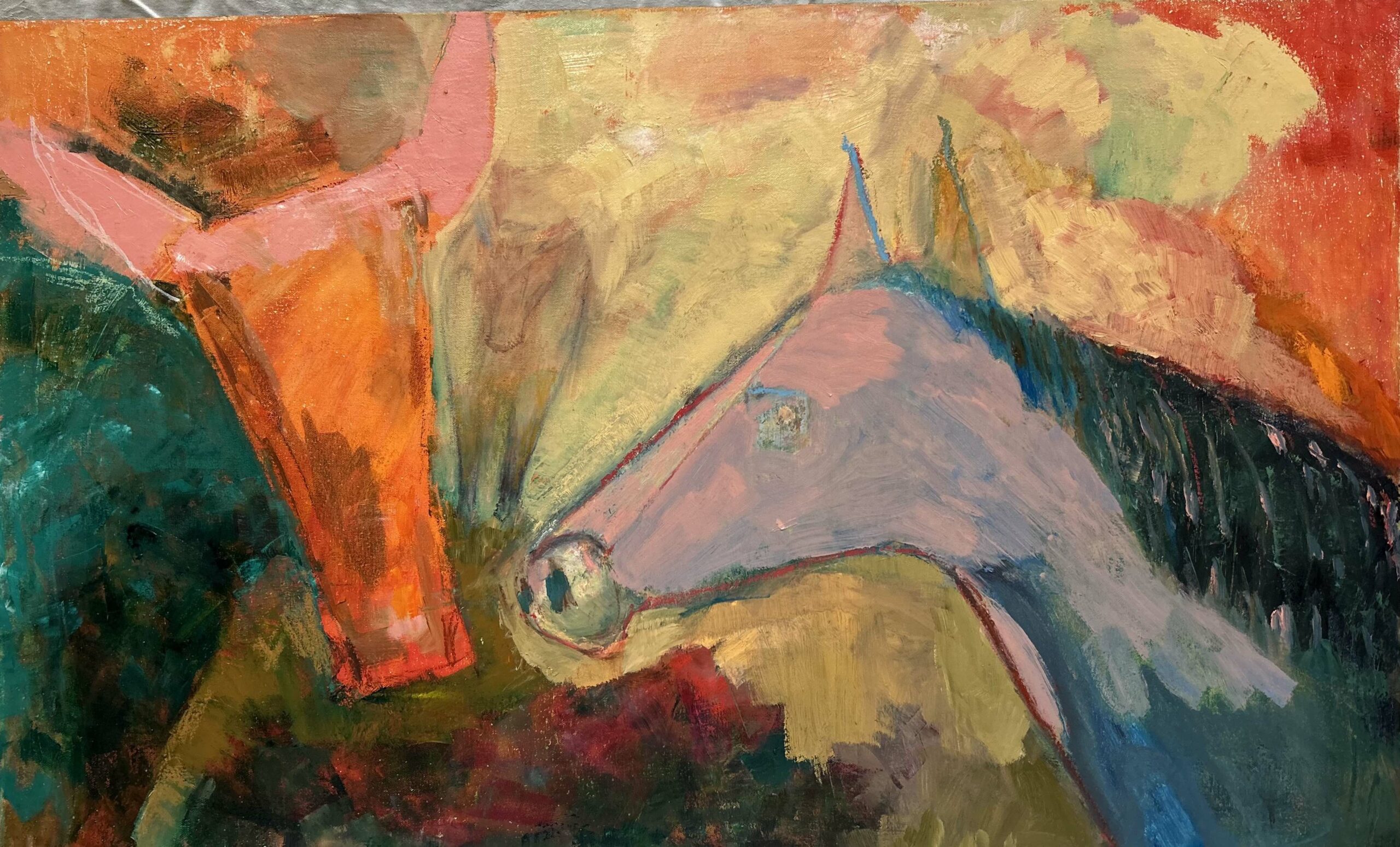 This is a vibrant and somewhat abstract painting featuring a pony, bull and cow against a background of warm, earthy tones. The style is loose and expressive with a bold color palette for the animals. The brushstrokes are visible, contributing to the textured quality of the image.