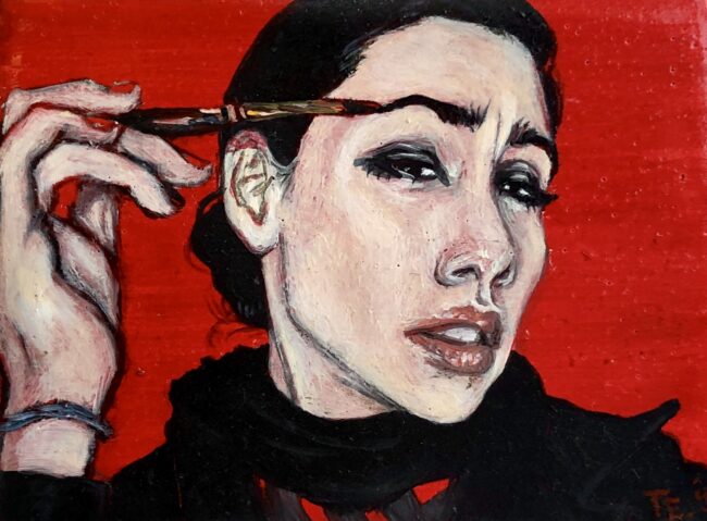 Miniature Self-Portrait – my signature piece of me painting my face with a red background