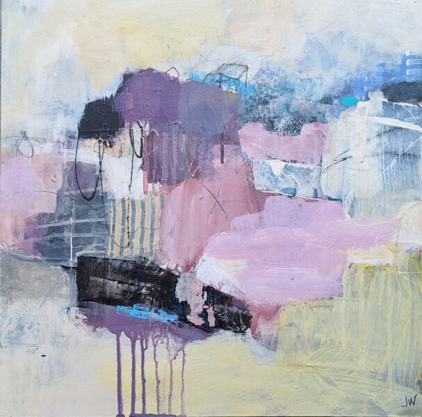 Abstract painting of clusters of shapes, patterns, and drawing surrounded by a light atmosphere.