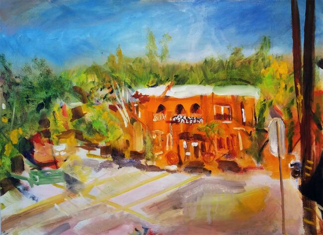 Expressionistic oil painting of the iconic dive bar Papermill Creek Saloon in Forest Knolls, 22″ x 30″ o/c