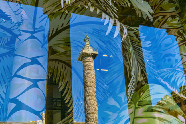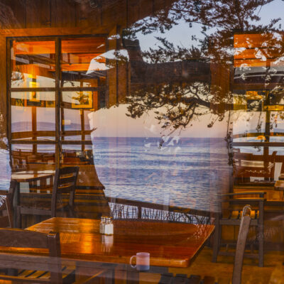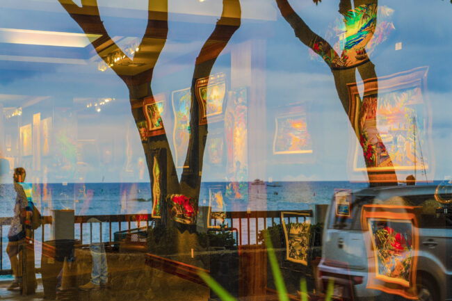 These photographs are each a single exposure. Window reflections are merged with what is on the other side of the glass. Looking through glass is always surprising. Changing the camera angle changes the reflections; shadows change the way objects show or do not show. Inanimate objects in a window can seem to have personality, as photographs are inanimate and yet arouse feelings. They evoke our double life: who we are inside and what we become outside.