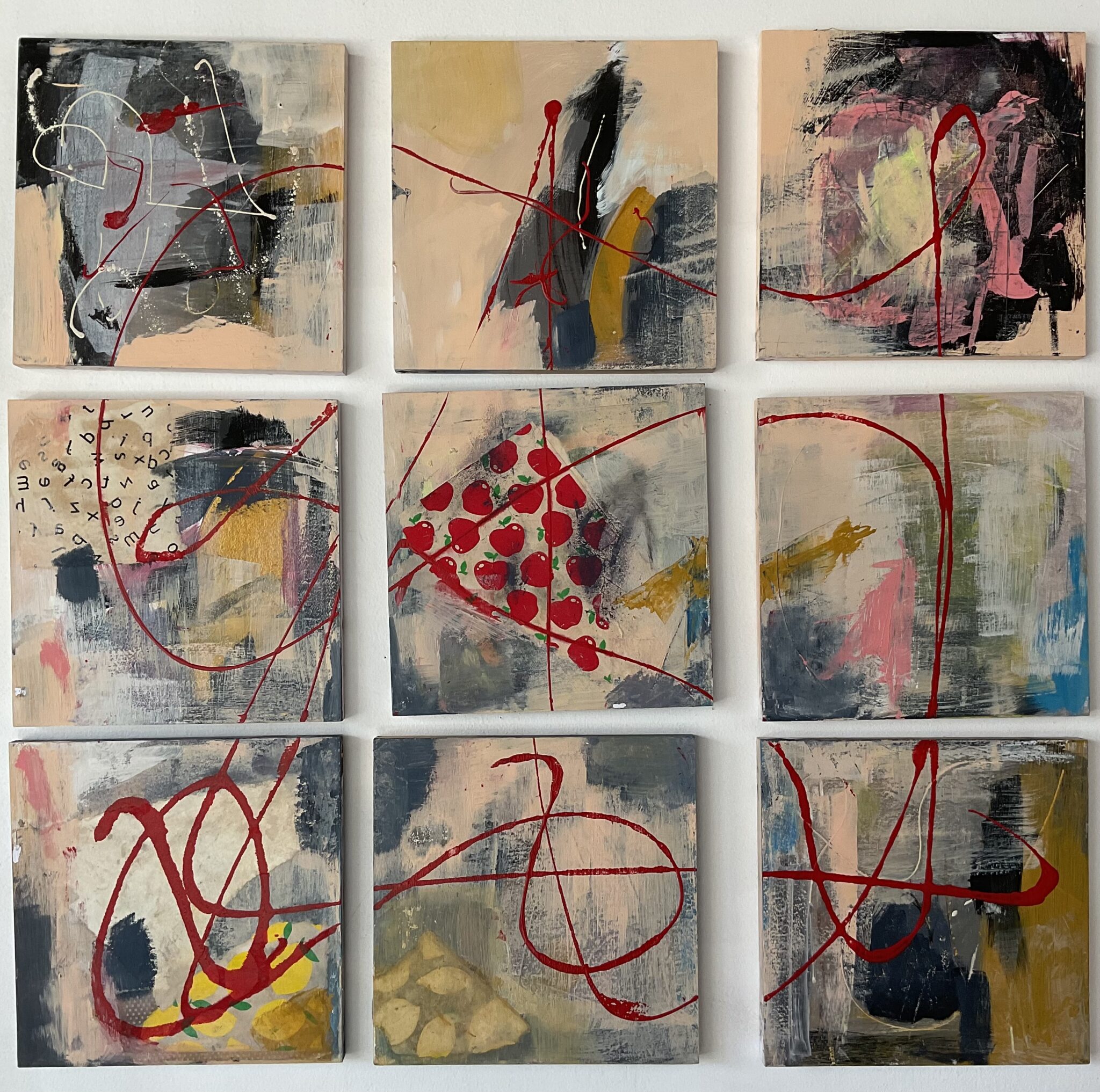 MIXED MEDIA ON WOOD PANNEL, 9 PIECES 10”x 10” each