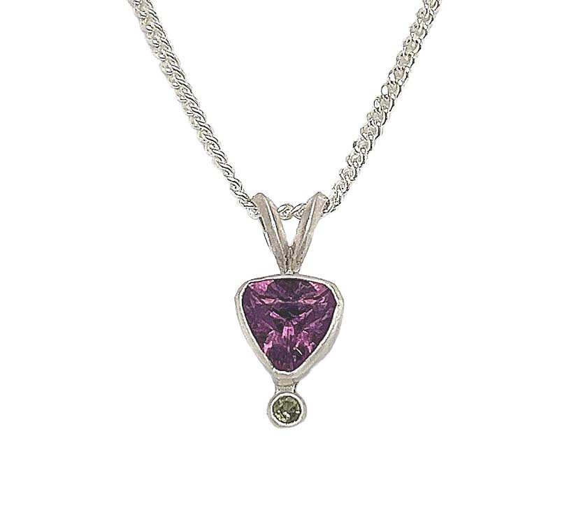 | Pink Fuchsia Tourmaline with Lime Sapphire Pendant. I faceted this 1.5 ct Afghanistan tourmaline with a unique facet pattern named ‘Port of Call’. It is very bright and has 2 rows of triangular facets on the table and 36 brilliant cut facets on the bottom. Set in Fine silver with a green sapphire accent. 18” Sterling silver chain included. ½ “h x ¼ “w. |