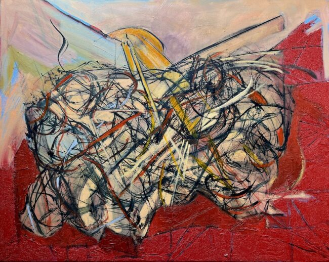 This began the same way all these other paintings did. At some point in the process I make the choice to go figurative or abstract, depending on what the canvas tells me. For this one, it was yelling “abstraction”