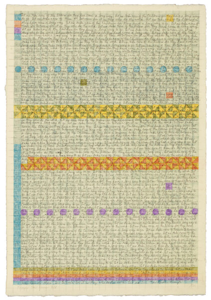 Print of a mixed media drawing, matted and framed. The African prayer, “Let us take care of the Elders for they have come a long way. Let us take care of the Children for they have a long way to go. Let us take care of those In Between for it is they who do the work”, is written repeatedly over the pencil pattern.