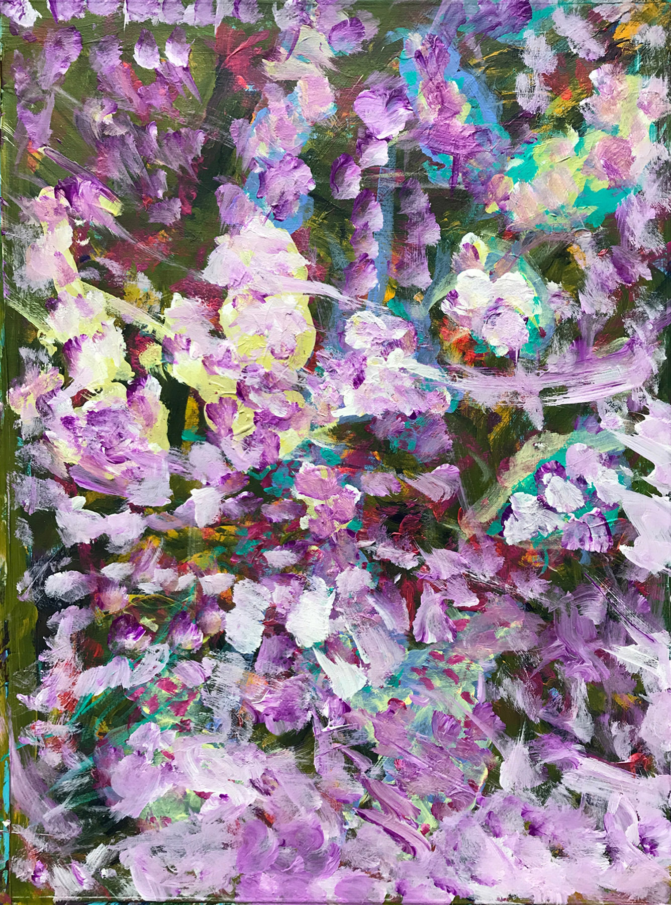 18″x24″ acrylic on paper. Love the color purple and the flower impression inspired this joyful painting.