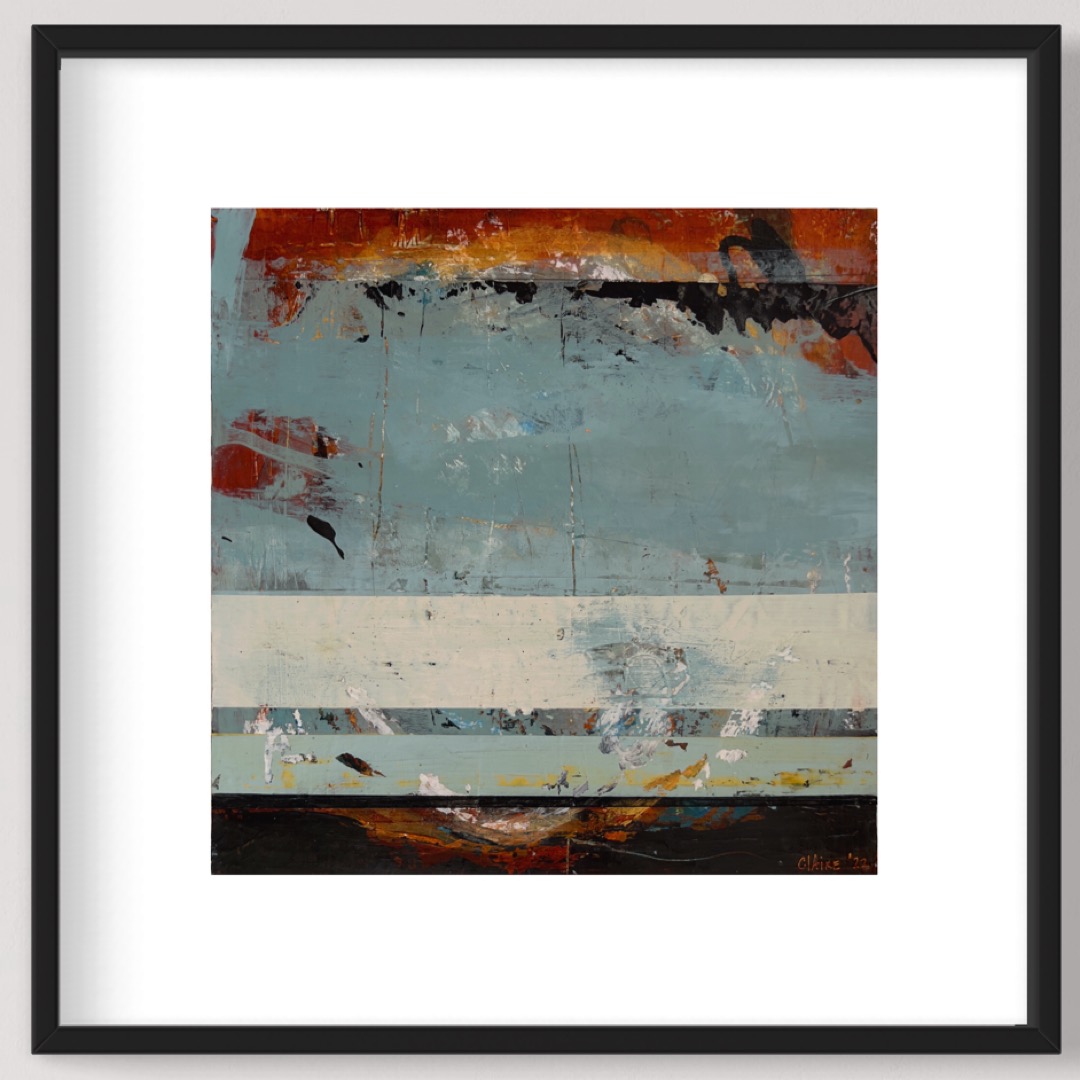 12”x12” acrylic/mixed media on birch plywood, framed with a white matte in a 20”x20” black frame