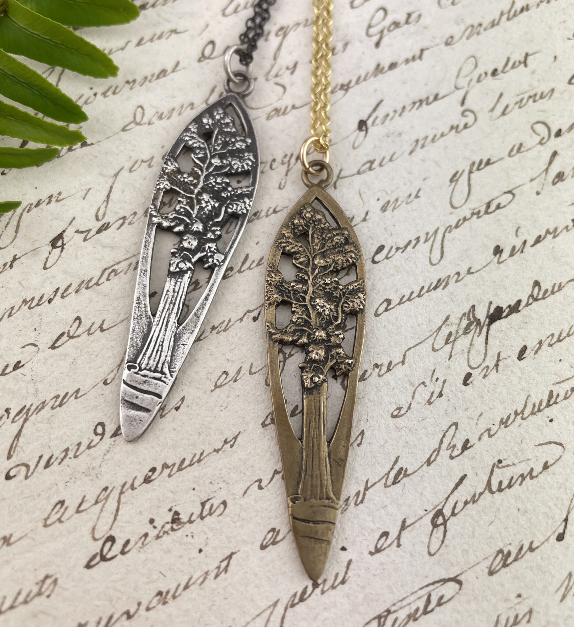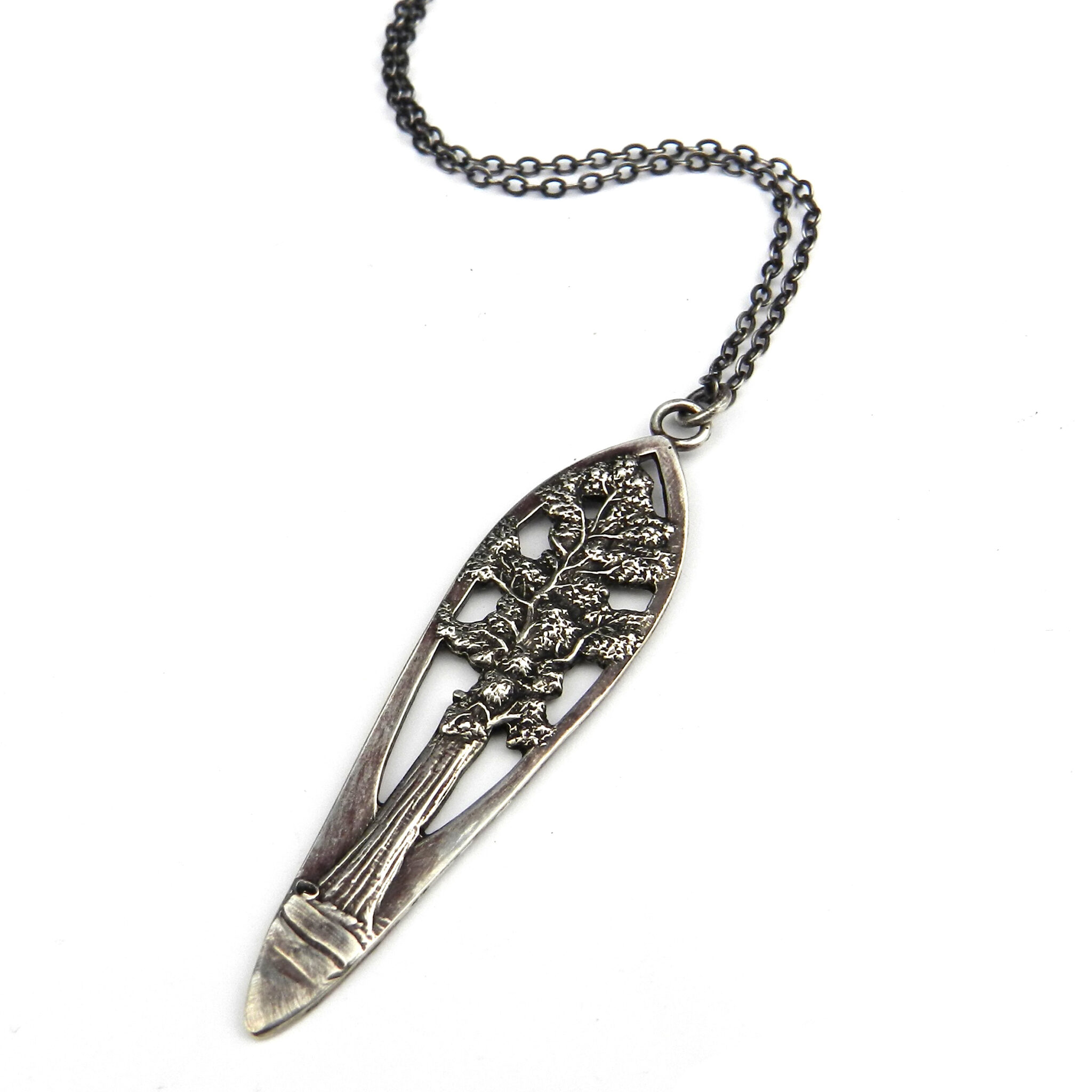 Our bestselling redwood tree pendant is carved from a vintage teaspoon handle. Celebrate the ancient mother redwood, Queens in the Sequoioideae subfamily. Their elegant shapes grace the foggy coastal areas stretching from central California and the Sierra to Southwestern Oregon. They can live a thousand years.