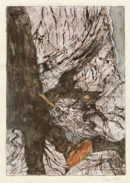 Natural pigments, silver leaf and ink on photopolymer photogravure print on paper 12″ x 8″ . Floated in a Natural wood frame 14″ x 11″