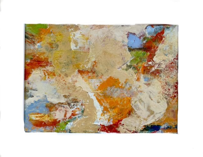 Although this small oil painting is characterized by its abstract nature, it evokes memories of summers spent at the beach. It has a textured surface created through thick, expressive palette knife application. The dominant colors are warm tones, including various shades of orange, yellow, and beige, with accents of blue, green, and red. There are also areas of white, which likely contribute to the texture and light in the piece.