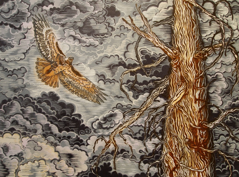 Carved on Japanese Shina plywood 13-color Reduction Block Woodcut Sennelier inks on Rives paper.