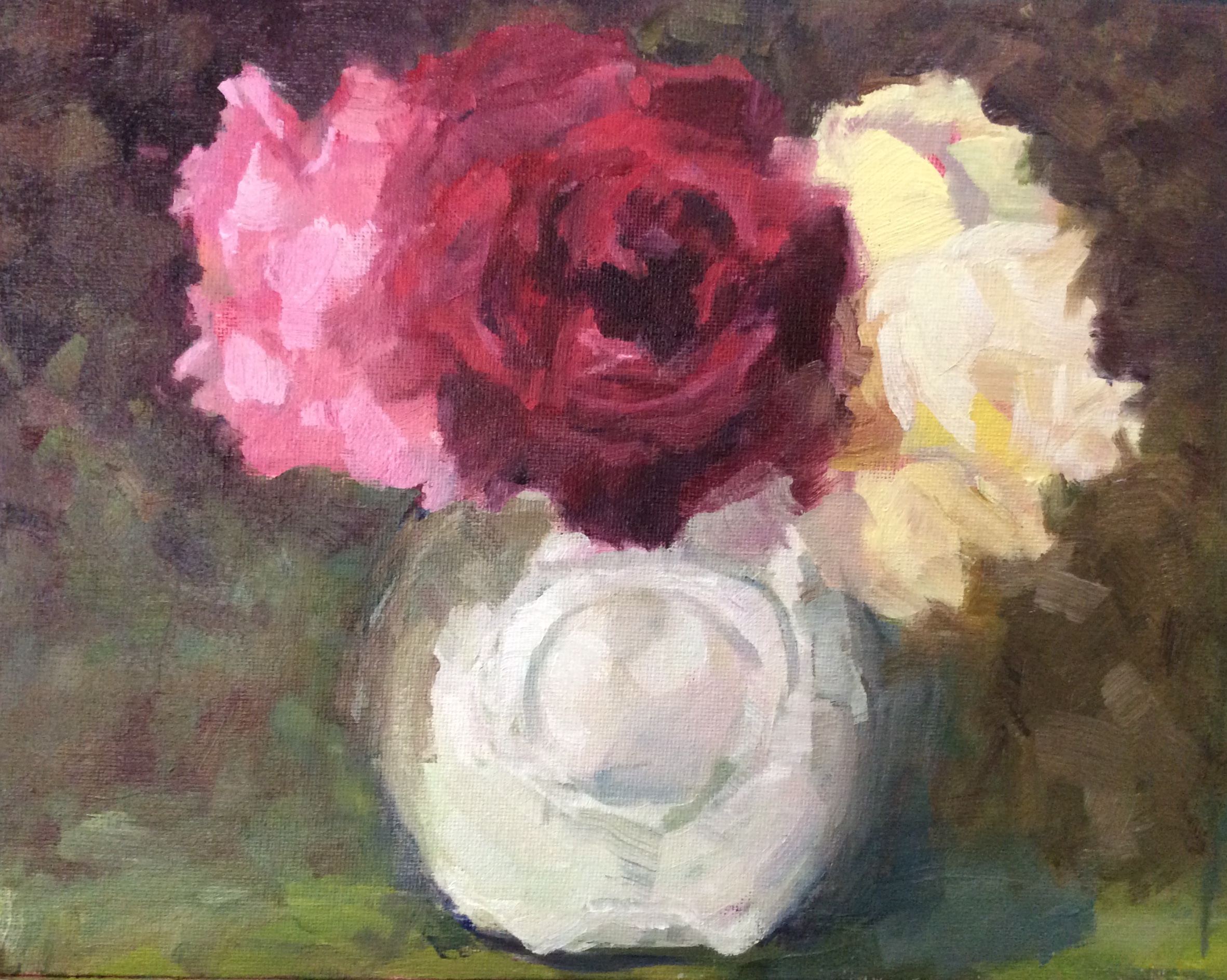 An 8†X 10†framed oil painting of three roses: Mr. Lincoln (red) Gertrude Jekyl (pink) and Icelandic (white) from my garden in a white vase that my sister a ceramic artist who lives in Pt. Reyes made.