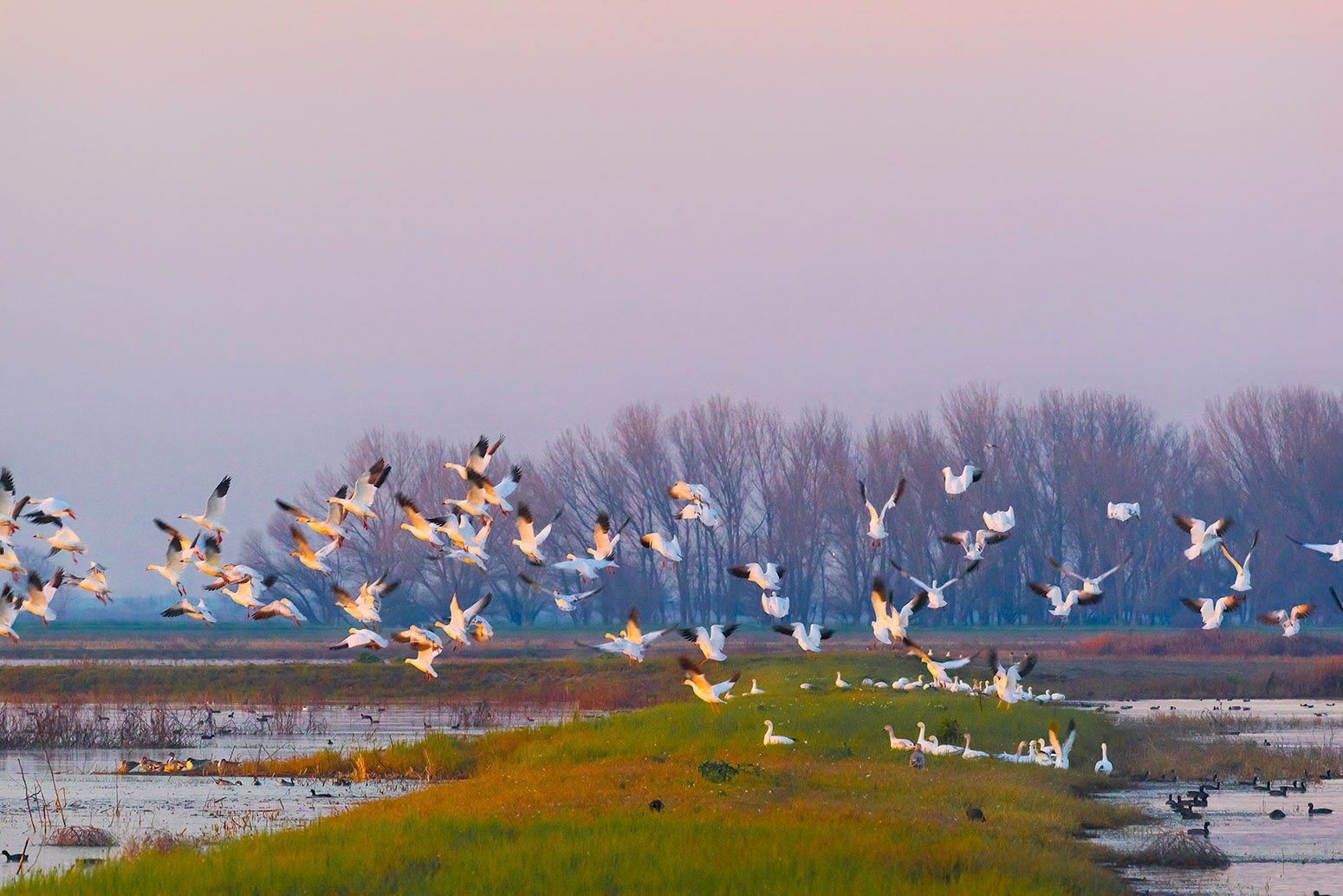 Ross Geese taking off at sunset at Merced National Wildlife Refuge, Merced County, California Photo by Rob Badger, part of “Refuge” series with Nita Winter