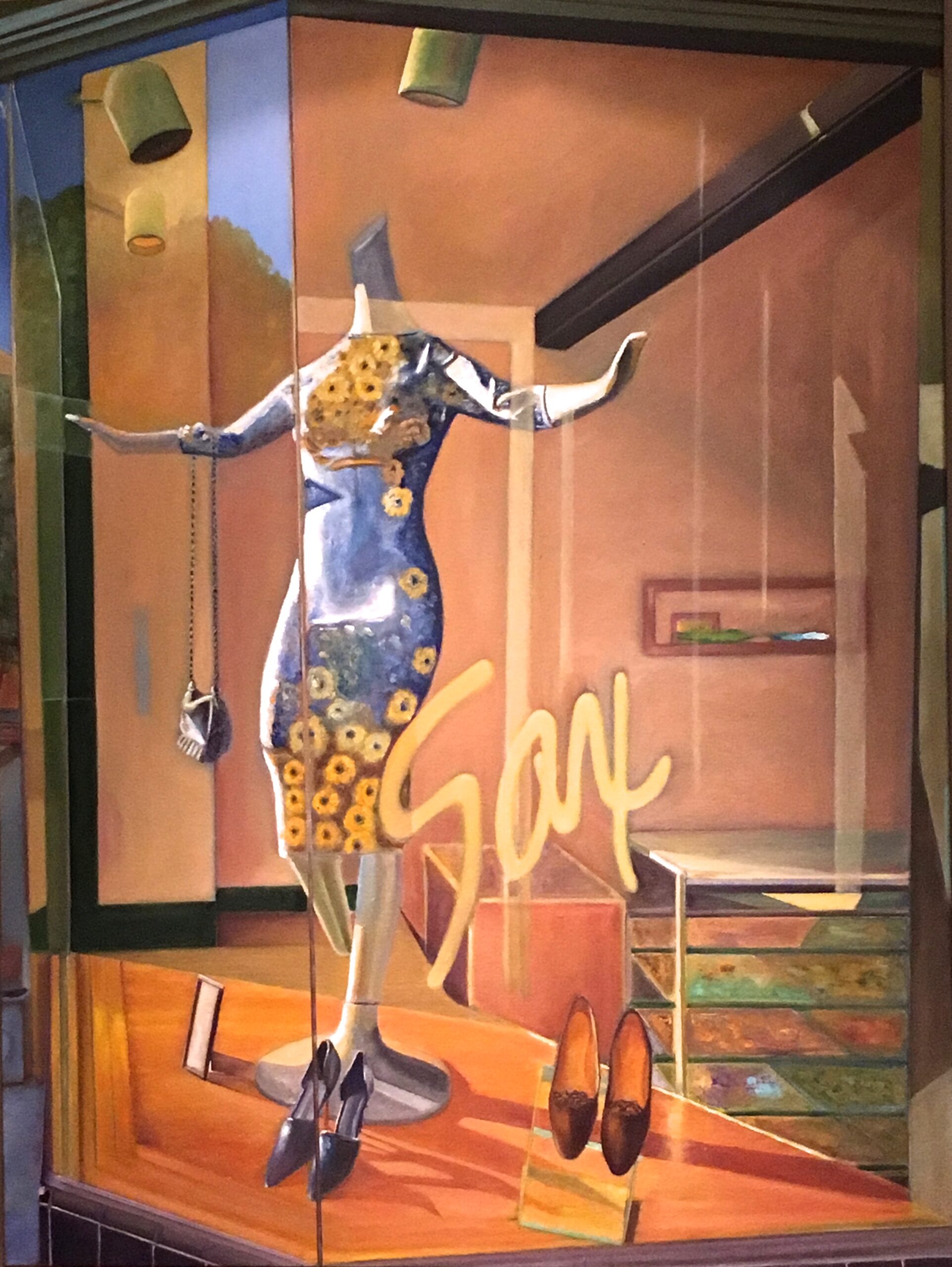 Sax Consignment Store San Anselmo CA. Often an interesting window display. The mannequin is always a willing model. 36″x48″ Oil on canvas.