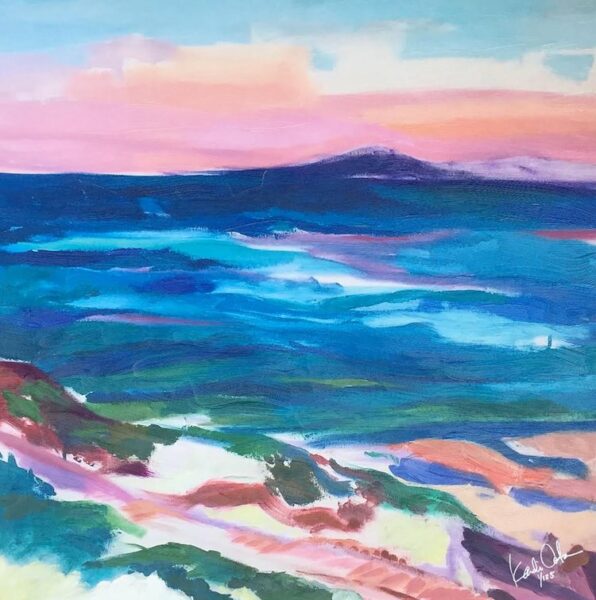 A romantic view of the beachwalk and lookout to Monterey at the beginning of sunset. The luscious pinks and turquoise are complemented by peaches greens and purples to create the setting of longing for the ocean at your feet.