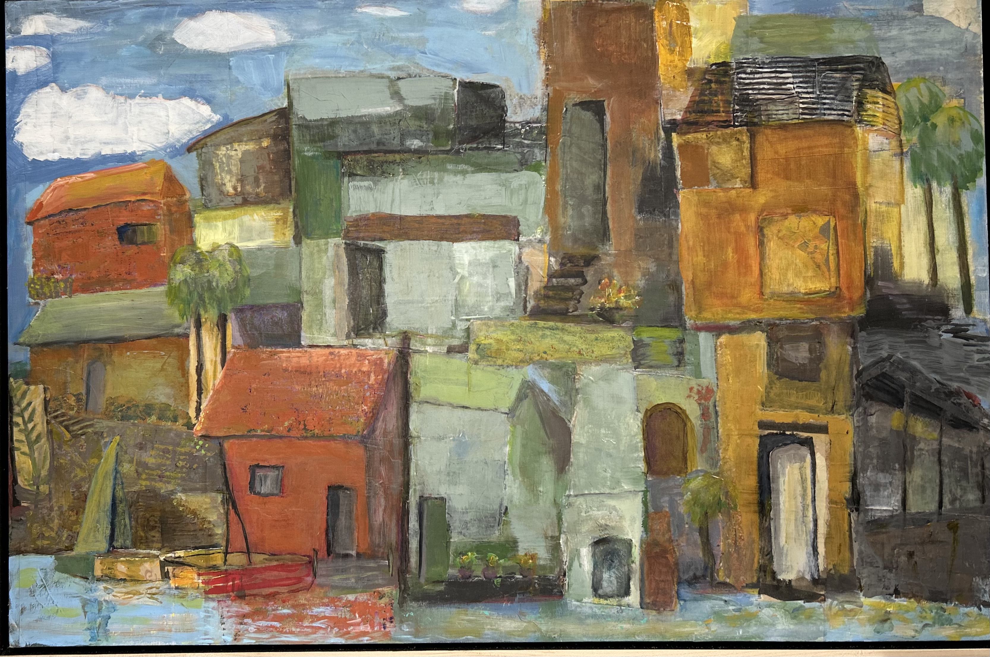 The Seaside Village painting has a sense of charm and memory with its naive and folk-like rendering of a set of buildings huddled together on a hillside next to a harbor.