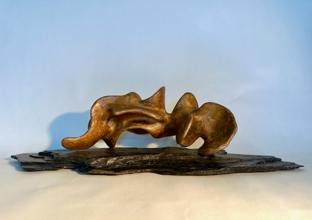 Silver and Gold, Biomorph Series, 7″ x 24.5″ x 6″, handbuilt ceramic sculpture, glaze-fired, sandblasted, oil painted, on a stone base.
