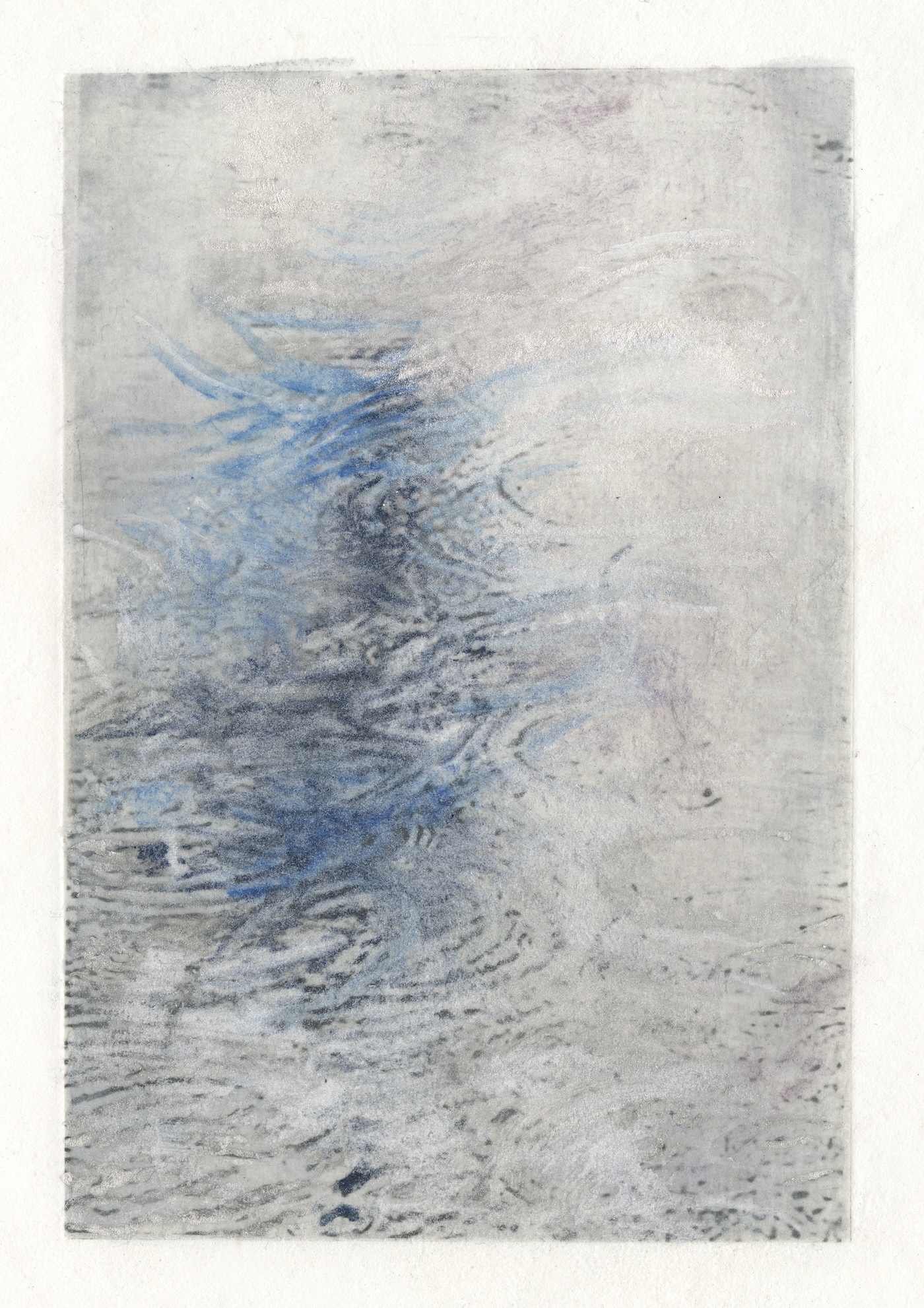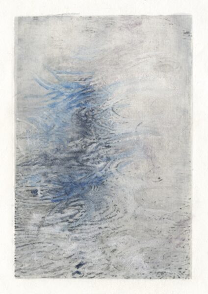Mineral Pigments over photopolymer photogravure print. 7″ x 4.5″ image floated in a 13″ x 11″ natural wood frame