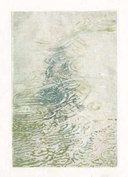 Mineral Pigments over photopolymer photogravure print. 7″ x 4.5″ image floated in a 13″ x 11″ natural wood frame
