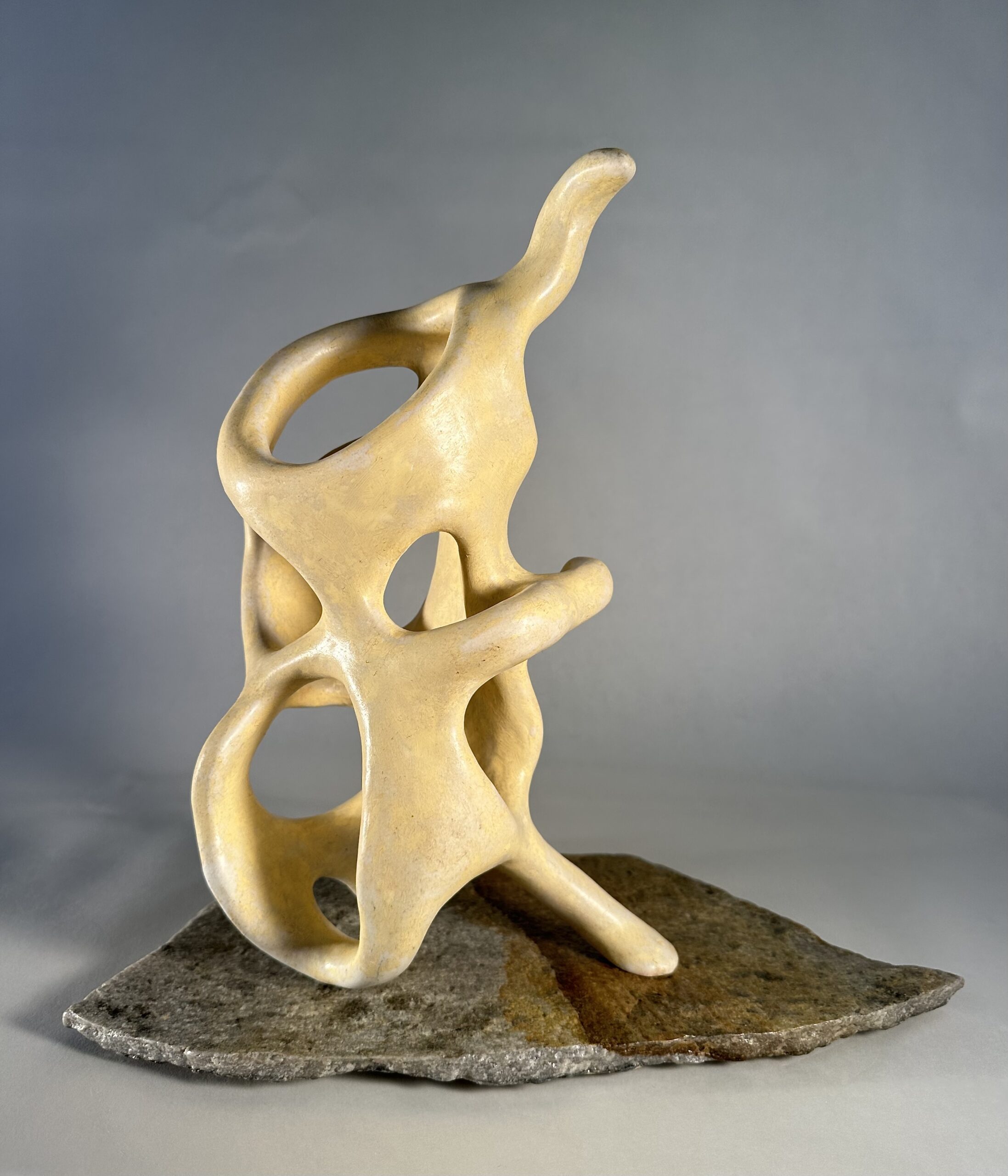 Soft Yellow, Biomorph Series. 14″ x 13″ x 8″. Handbuilt ceramic sculpture, glaze-fired, sandblasted, oil painted, on a stone base.