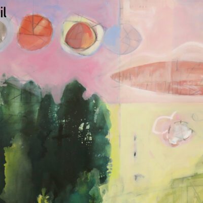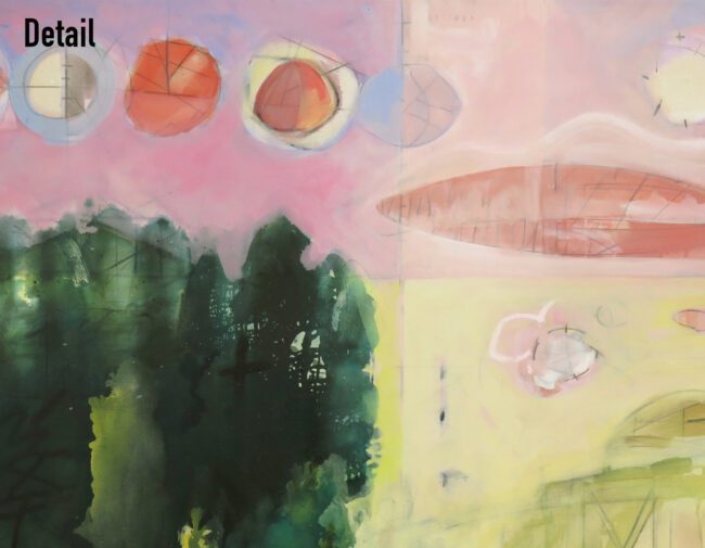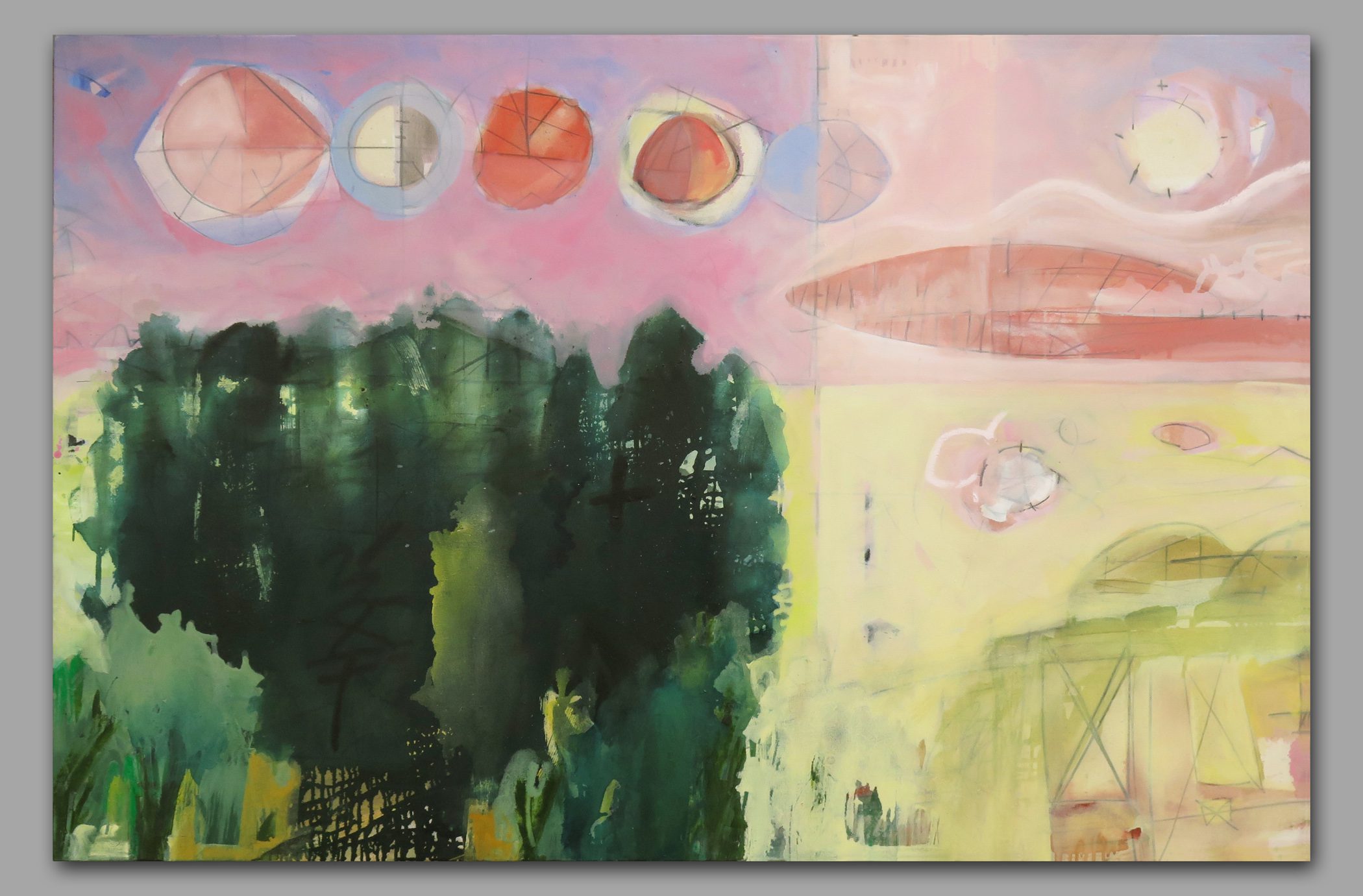 Oil and charcoal on canvas on panel. 48h x 70w inches. No frame required. Signed on left edge.