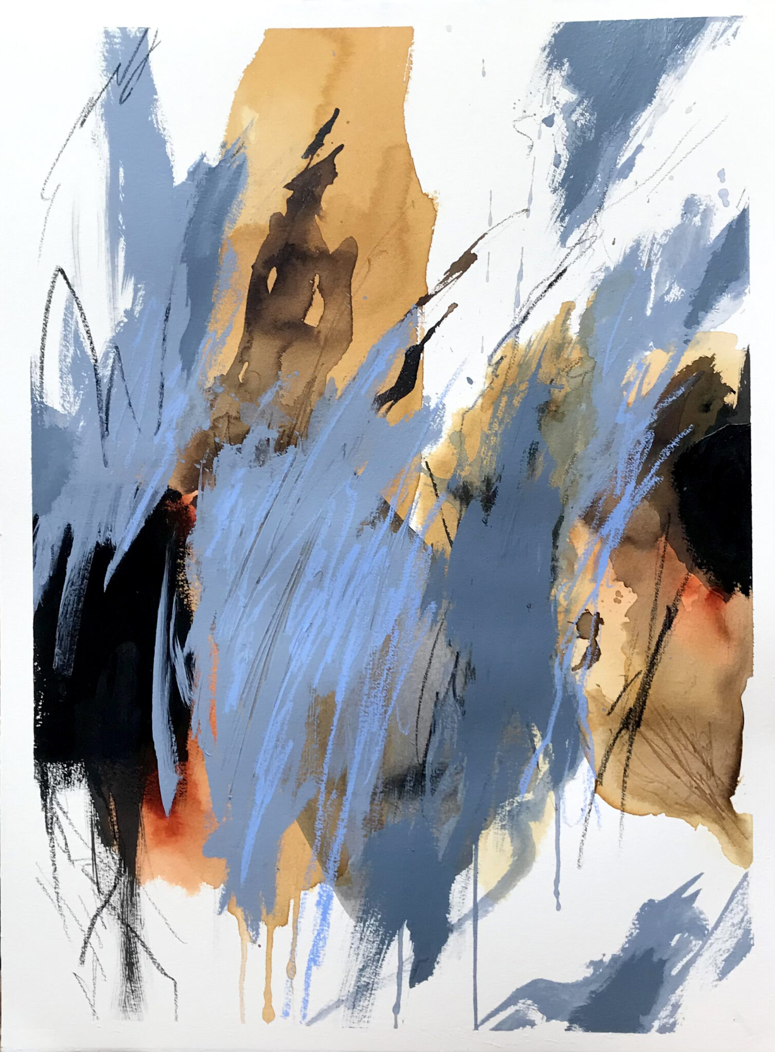 Exciting, gestural abstract painting in brown and blue tones. Work is on watercolor paper 30″ x 22″. (Unframed)