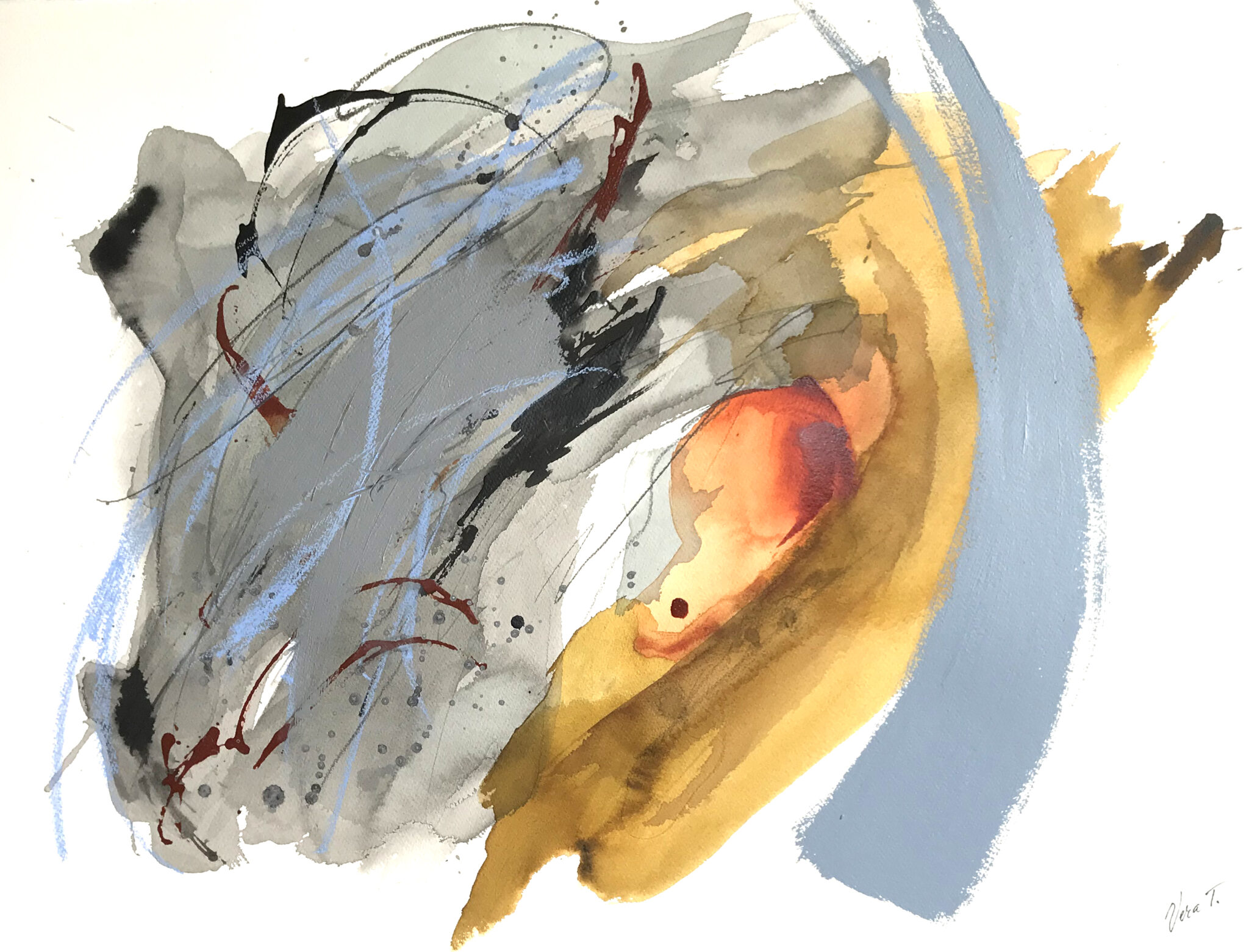 Elegant and joyful abstract painting in the colors of fall: orange, brown, grey, and blue. Work is on heavy watercolor paper, 22″ x 30″. (Unframed)