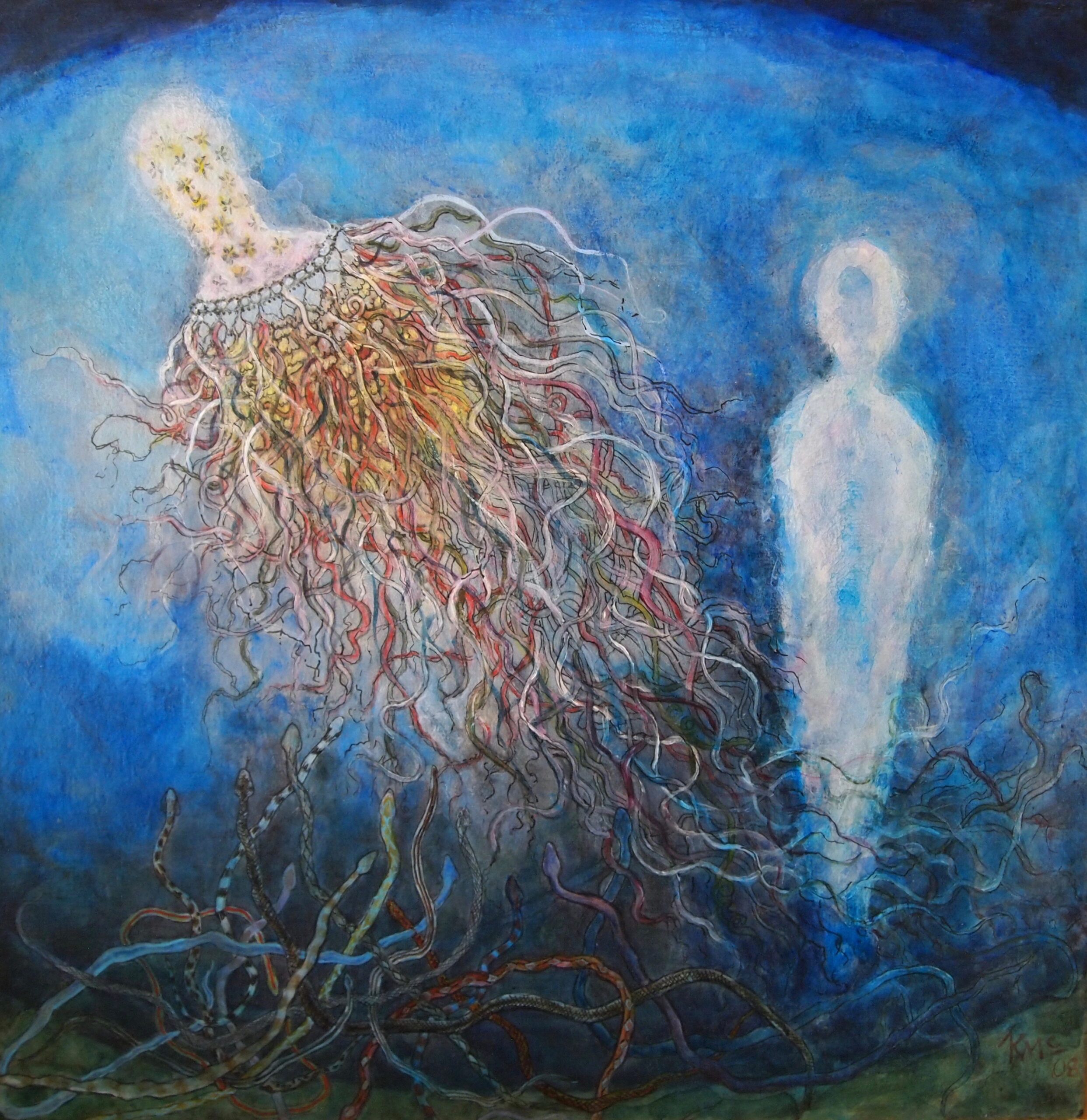 Acrylic on canvas 12″ x 12″. I had this notion of jellyfish as a symbol for our souls. They way they move.