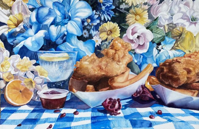Still Life with Flowers, Fish and Chips and Pomegranates by Paulette Engler Published: January 14, 2023 (3 years ago) Contact For Pricing CategoryART MEDIUM - 2D / PAINT: WatercolorGreat fun to paint food. Send Message Your Name * Your Email * Subject * Message * Website Address