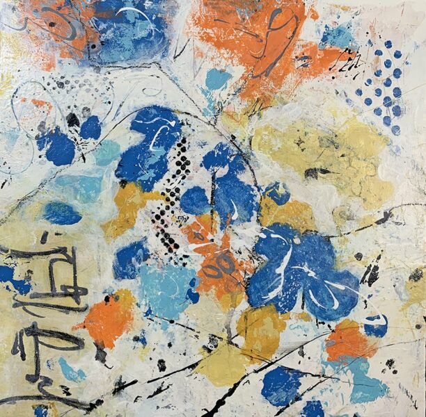 A mixed media abstract using acrylic paint and handmade collage on a cradled wood panel. Comes in a wood floater frame. Size 12″ x 12″