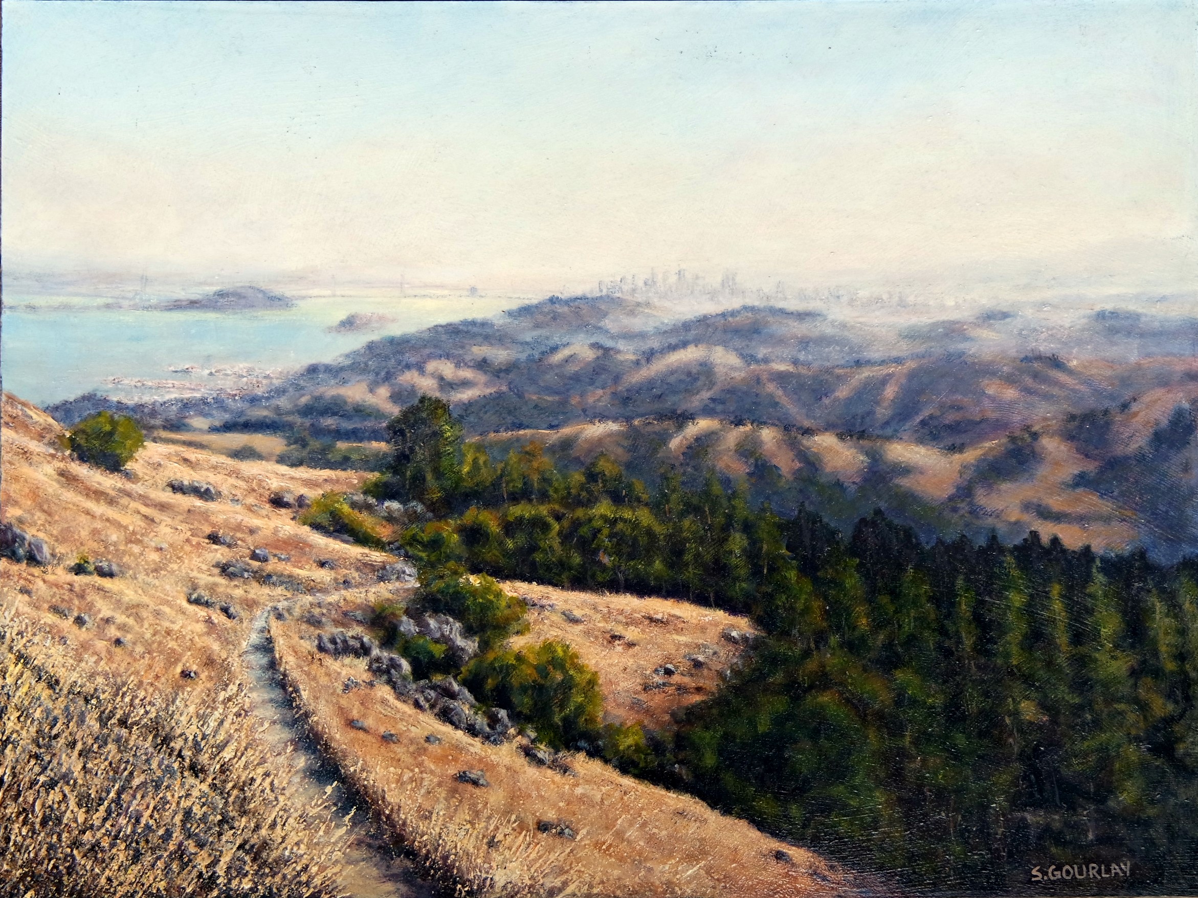 Oil on textured hardboard panel 18 by 24 inches. From Mount Tamalpais one looks Southward over the dry grasses atop the Marin Headlands toward San Francisco with its ever present Summer fog.